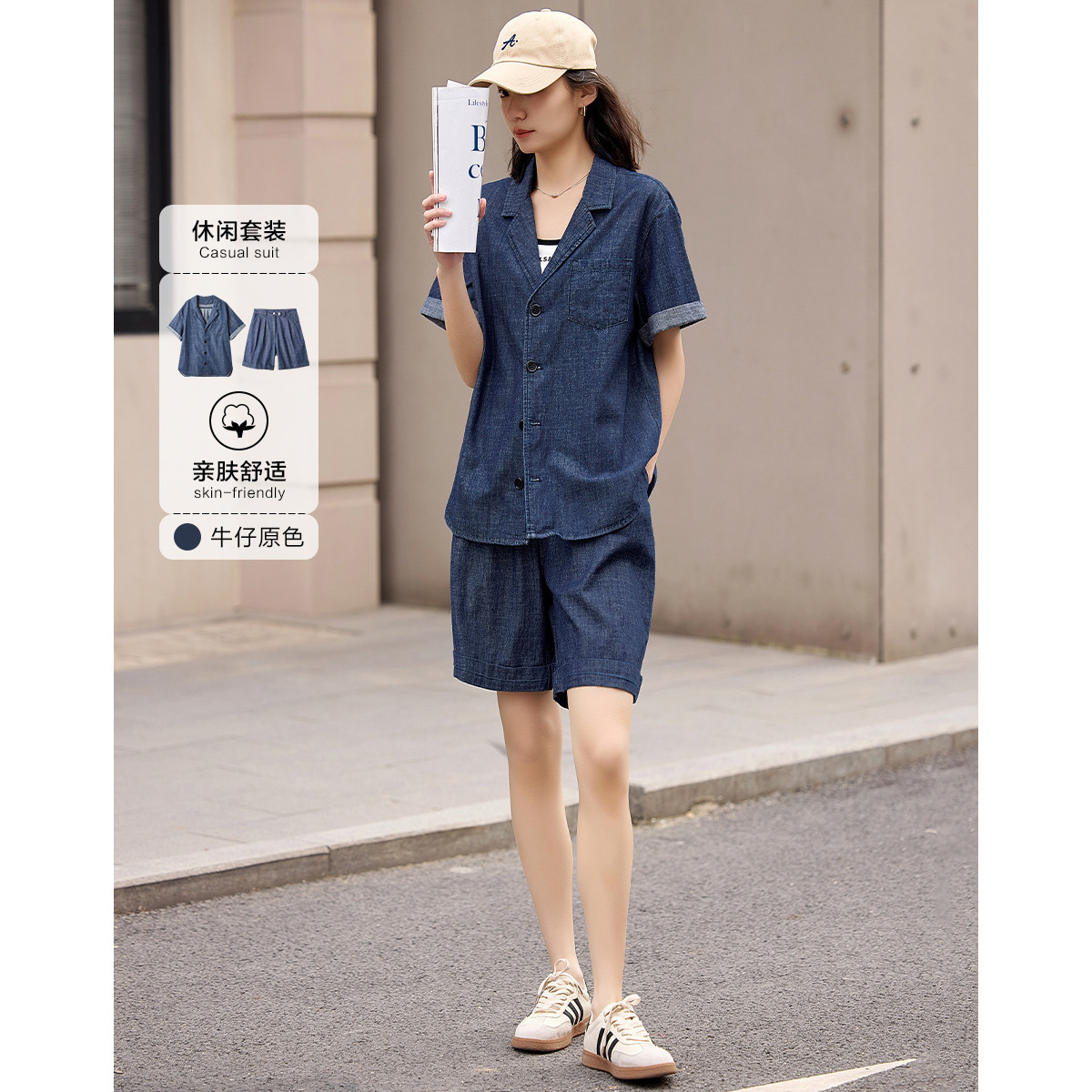 【简单百搭西装式牛仔短袖套装】设计时尚感女士两件套 107074