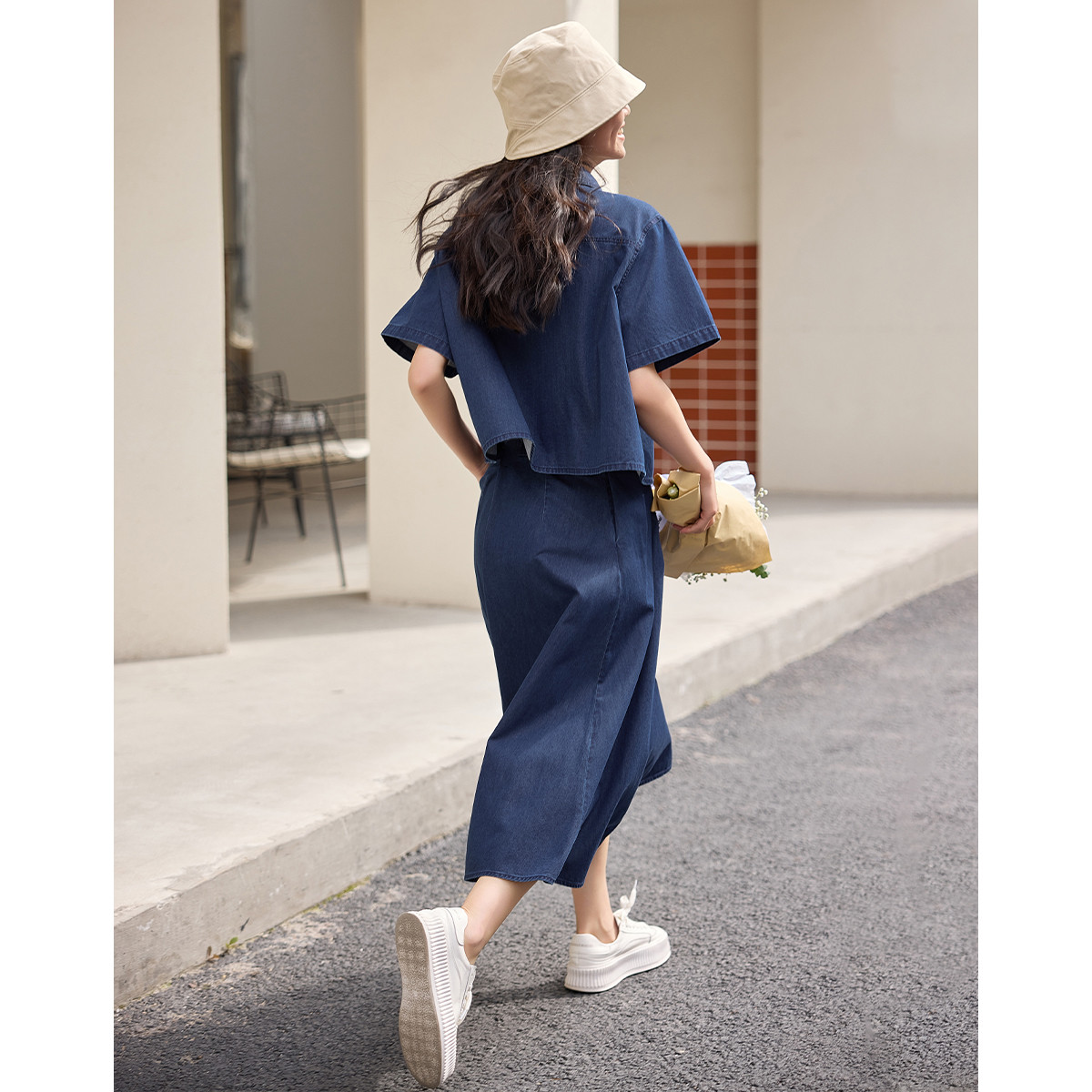 【牛仔套装】夏款网红风翻领短袖纯色牛仔半裙两件套女 248386
