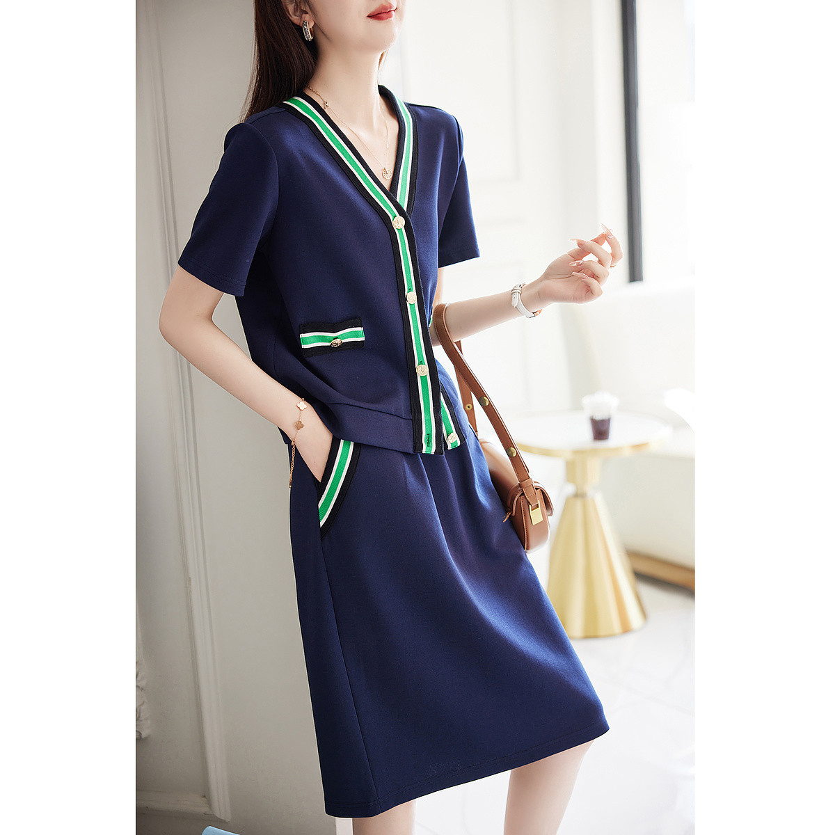 【珠地空气层套装】夏V领短袖上衣拼色直筒半裙两件套 036929