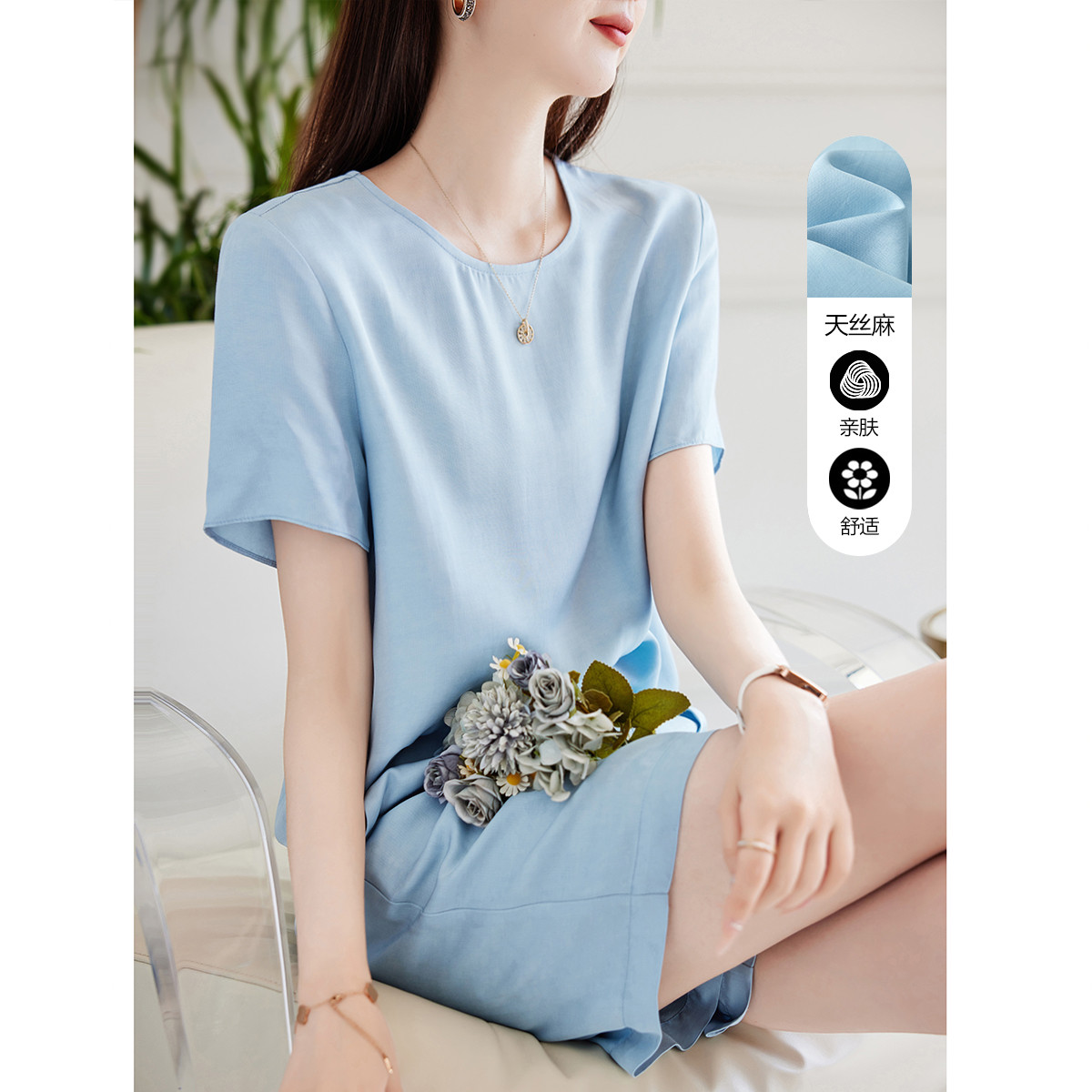 【天丝麻休闲套装】夏季圆领短袖上衣短裤两件套 864193