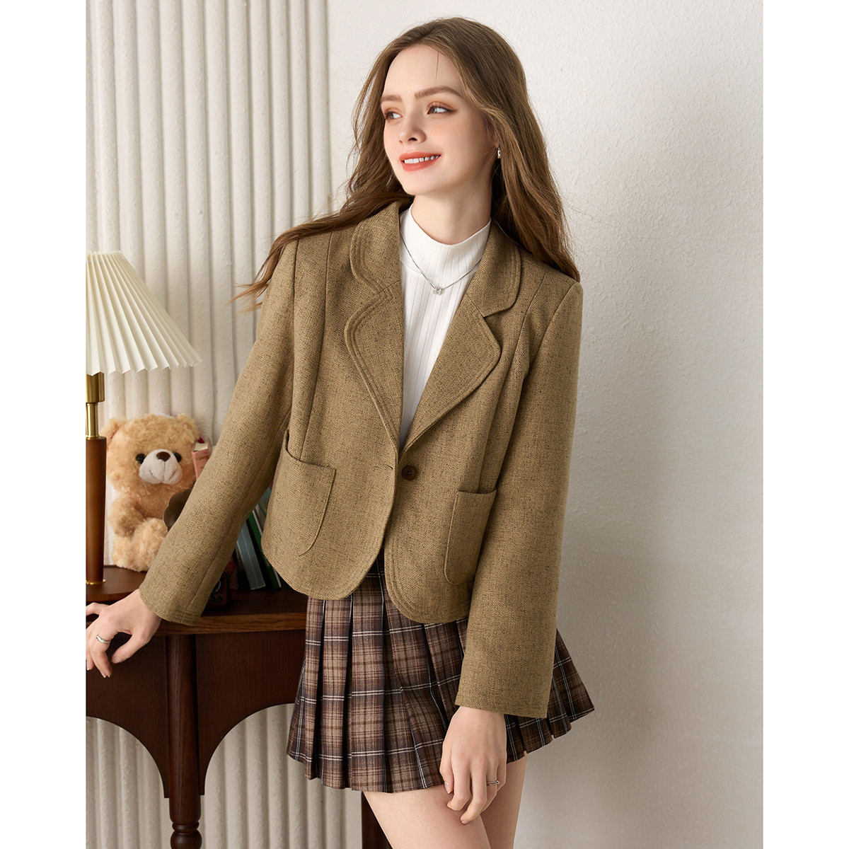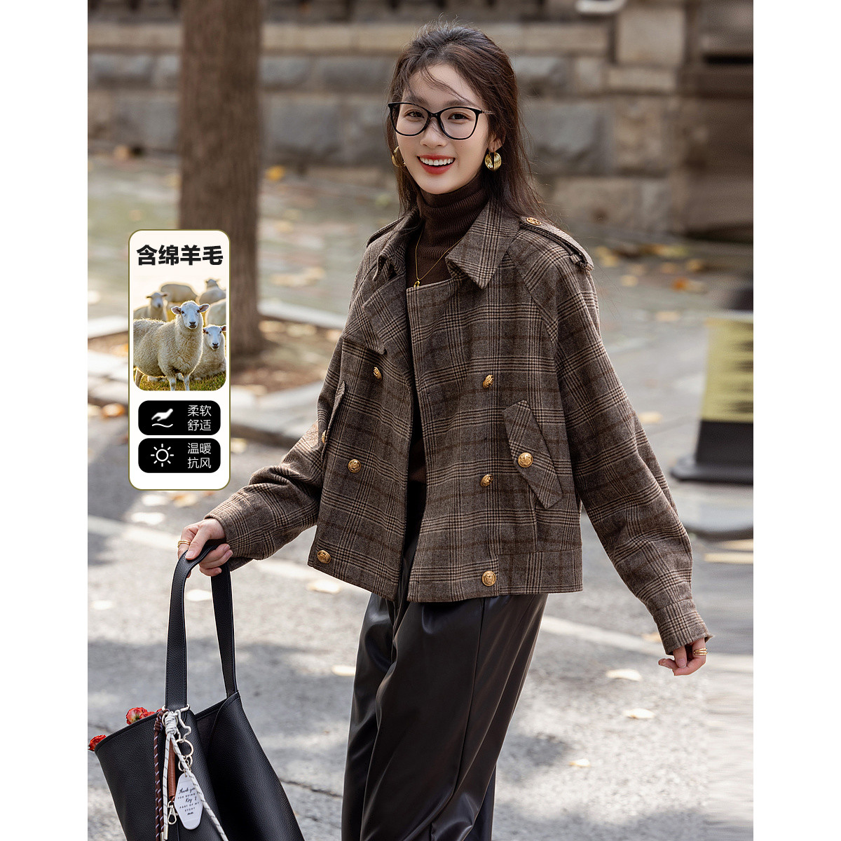 【复古港风】春秋酷飒含绵羊毛格纹双排扣肩袢育克休闲外套女短款 951041