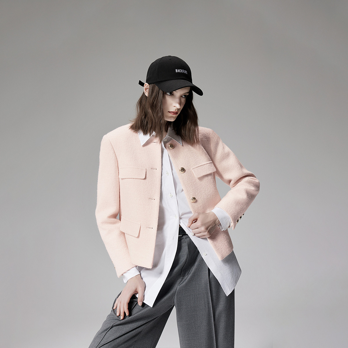 【低饱和穿搭】冬静奢质感都市翻领落肩口袋装饰夹克式外套女短款 716161