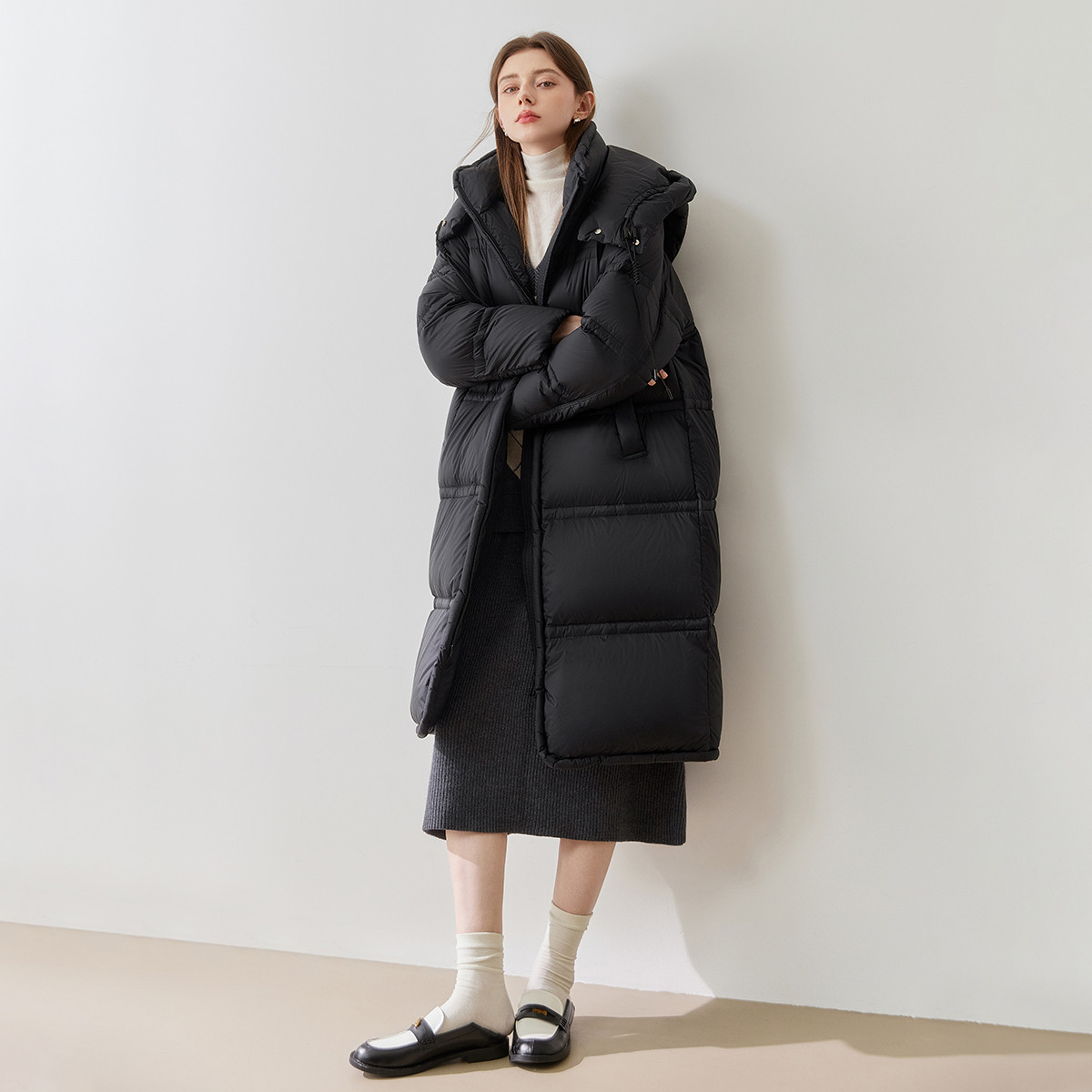 女式气质高领菱格纹品质抽绳收腰显瘦长款羽绒服 714847