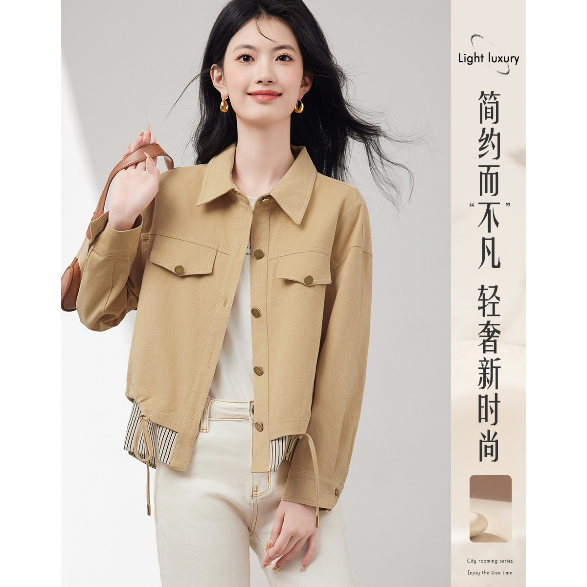 短款牛仔外套假两件春春小个子抽绳收腰休闲条纹拼接百搭上衣 701400