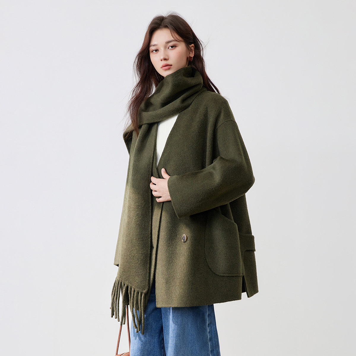 【100%绵羊毛+围巾】2024冬季轻奢宽松双面呢大衣外套女 778004