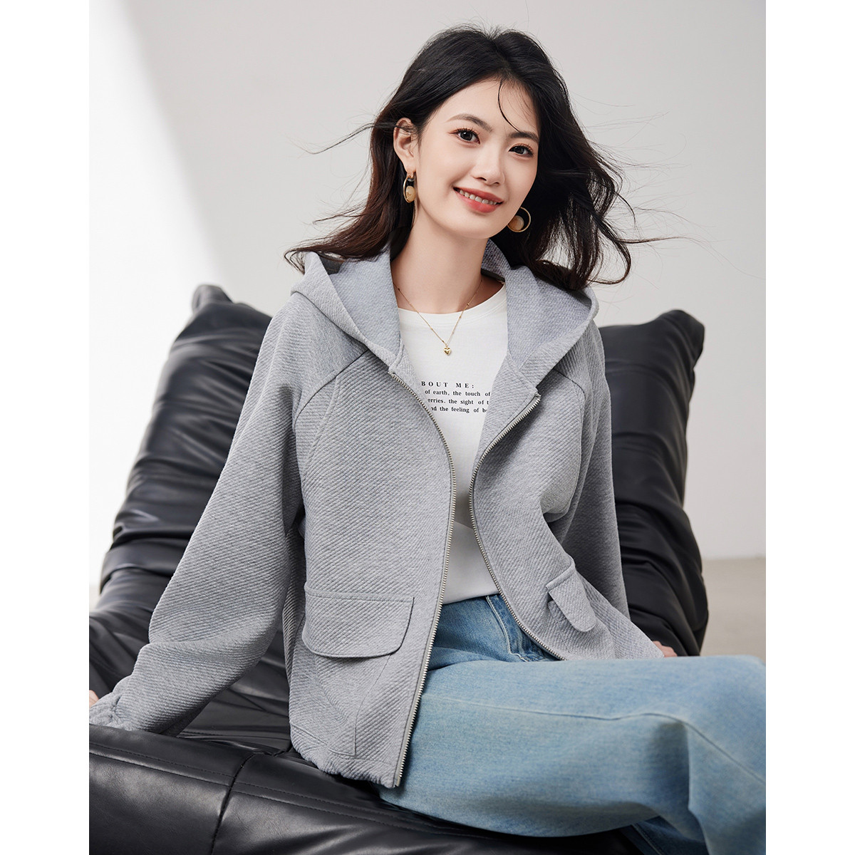 休闲百搭连帽外套女2025春季新款时尚宽松短款针织卫衣开衫女 296600