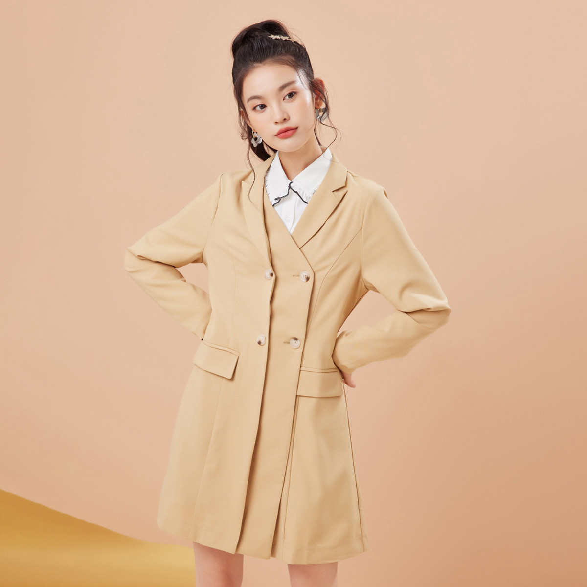 不对称设计感双排扣外套女春季英伦休闲西装制服别致中长款大衣 703064