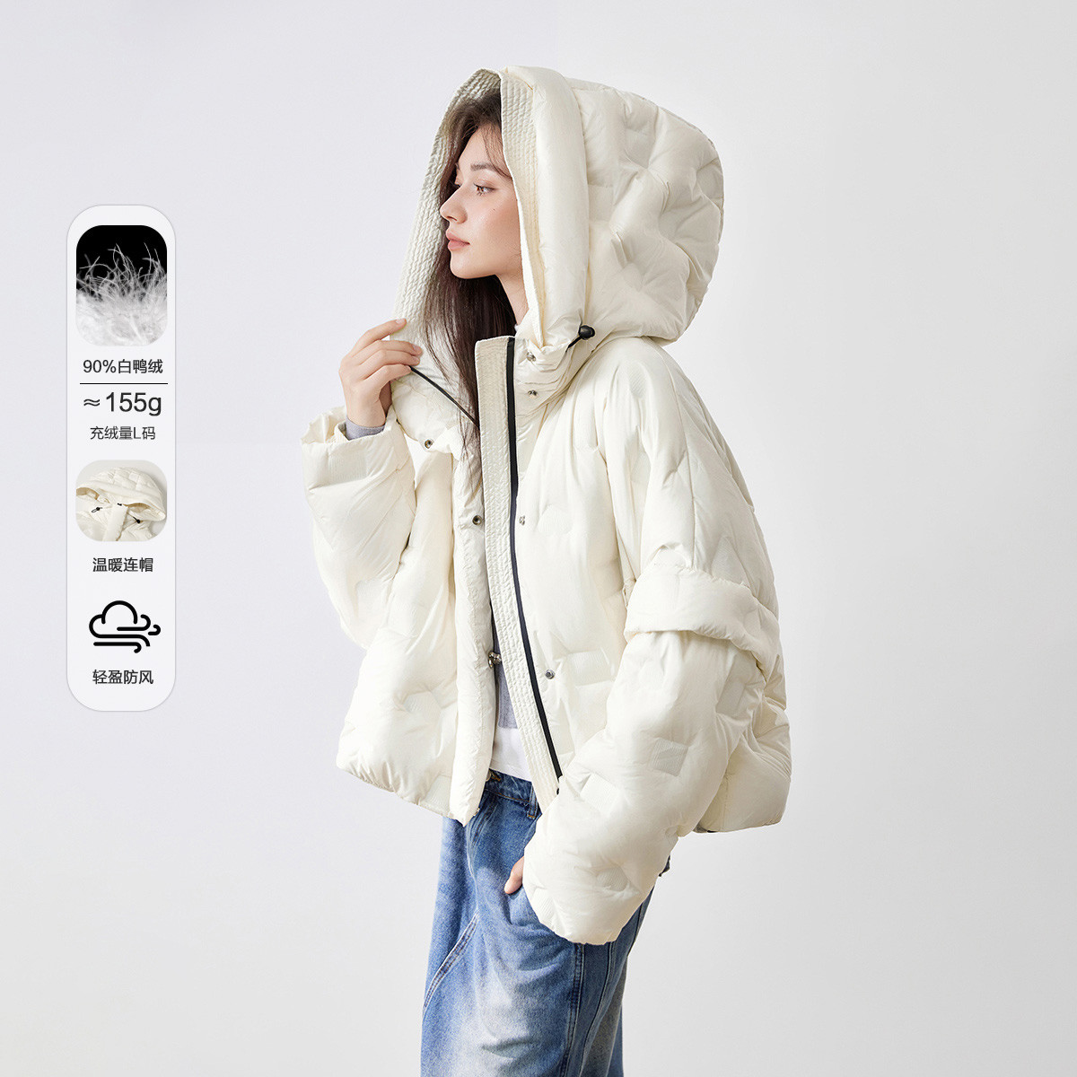 【90白鸭绒】24年冬季菱格连帽个性短款羽绒服女轻盈面包服 696084