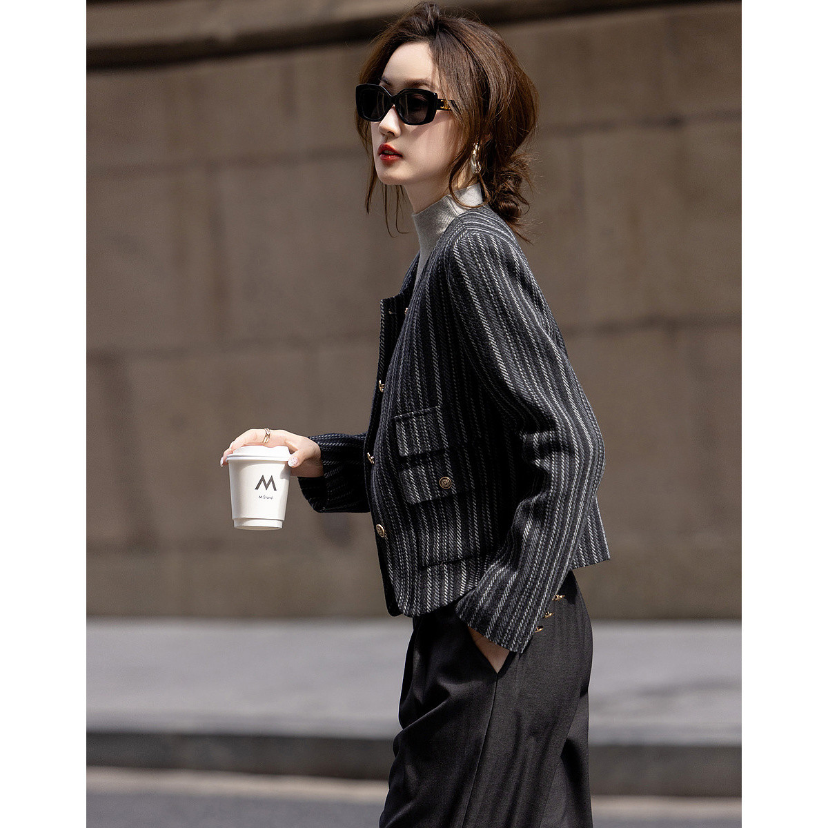 【逃不过小香风】春秋财阀御姐复古条纹金属扣装饰藏肉外套女短款 220737