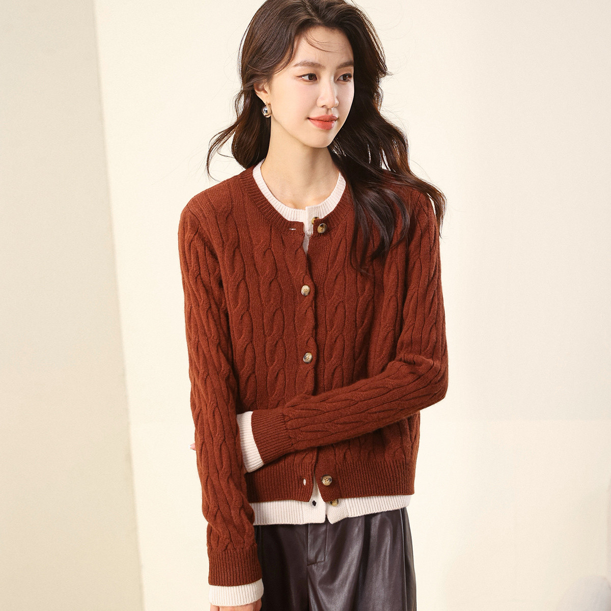 【假两件】100%羊毛撞色绞花针织打底开衫毛衣外套羊毛衫 974355