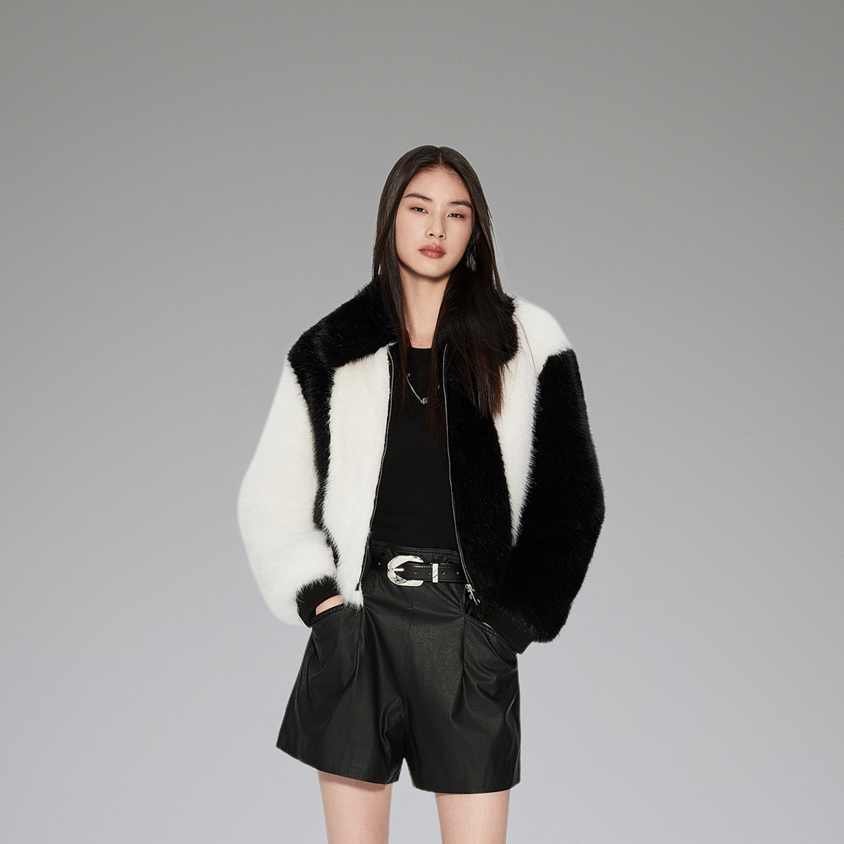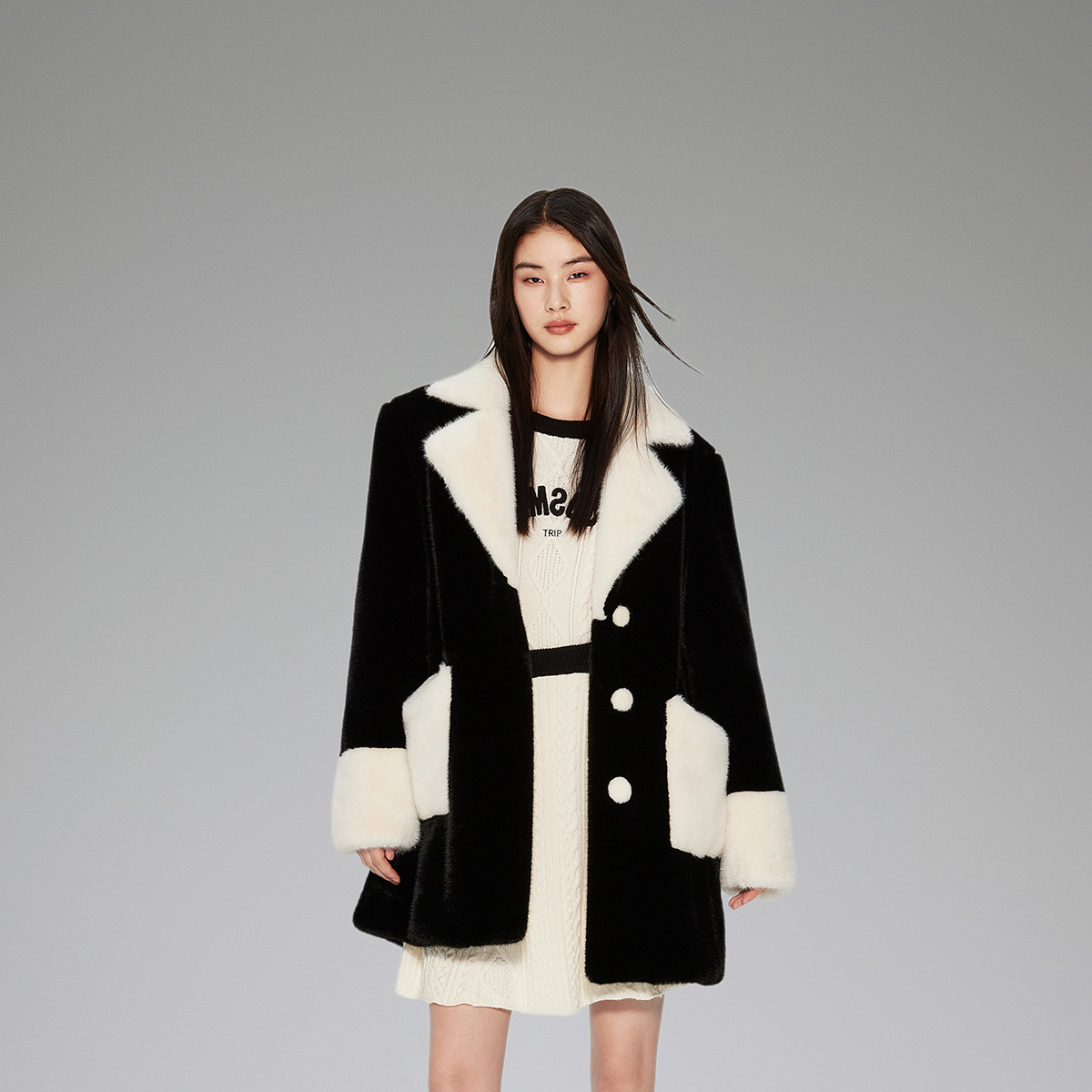 春装 撞色驳领软糯中长大衣高级环保仿皮草外套女 056527