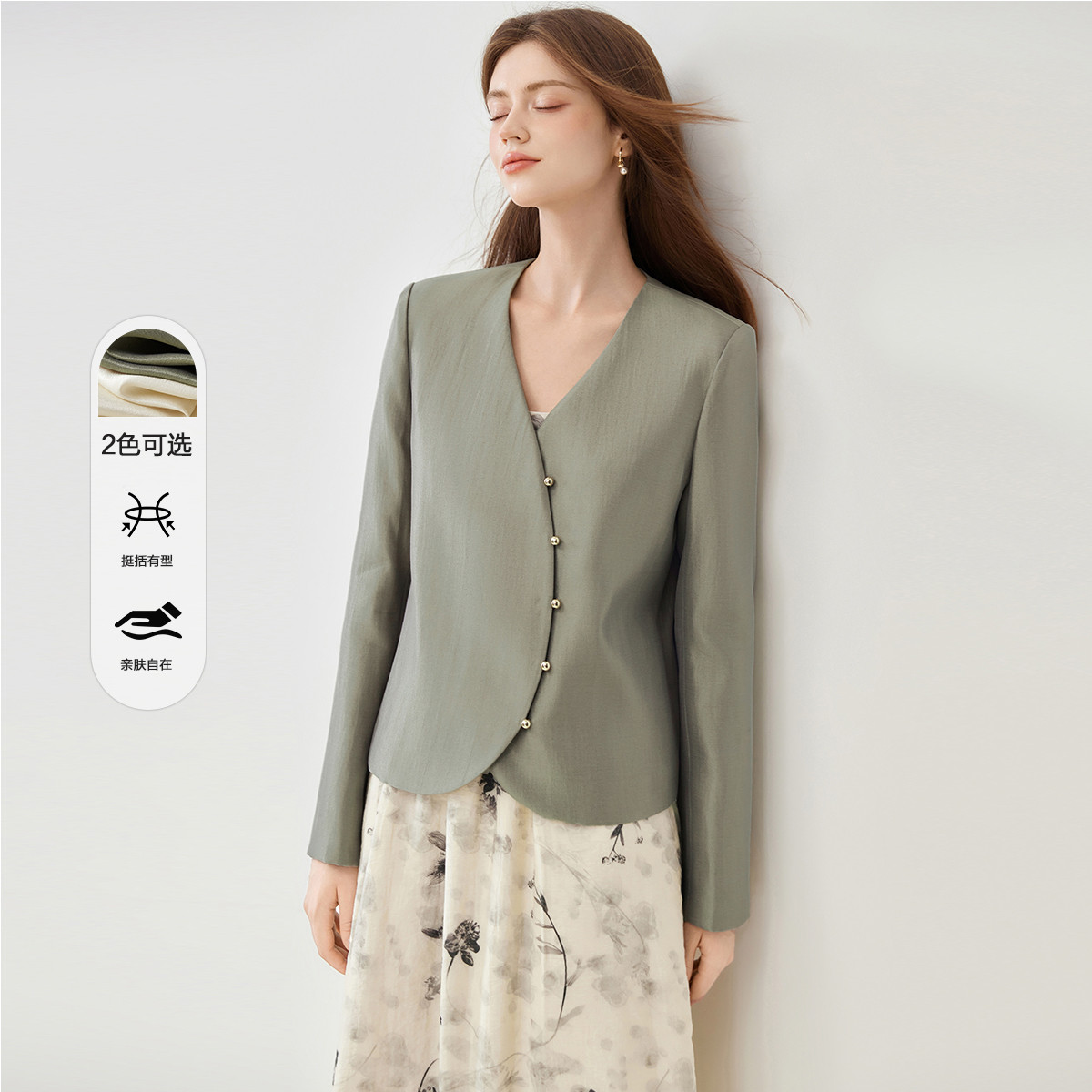 【2024秋季】新中式设计感气质短款外套女简约V领上衣 510036
