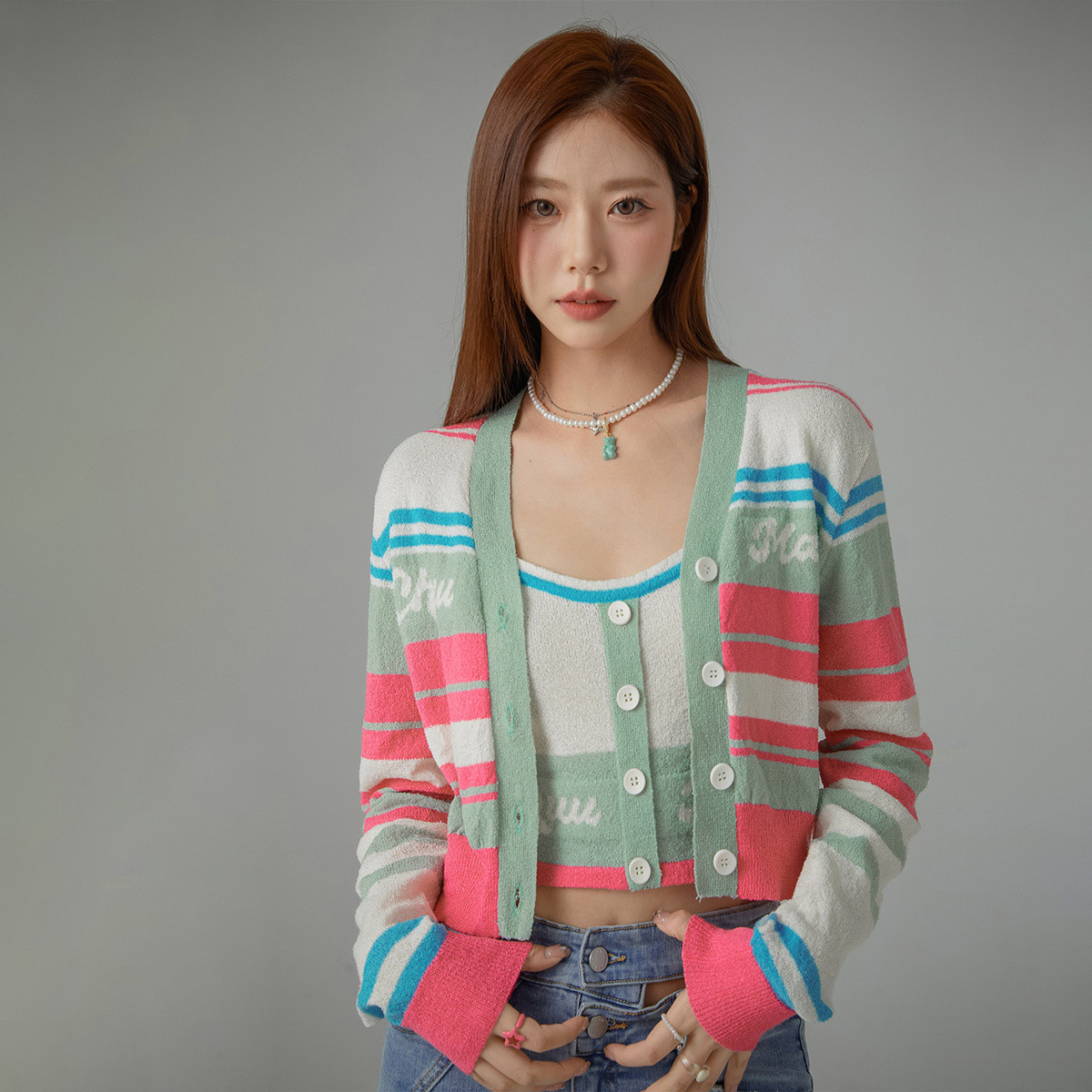 条纹针织开衫女春秋字母单排扣上衣小衫短外套 260819