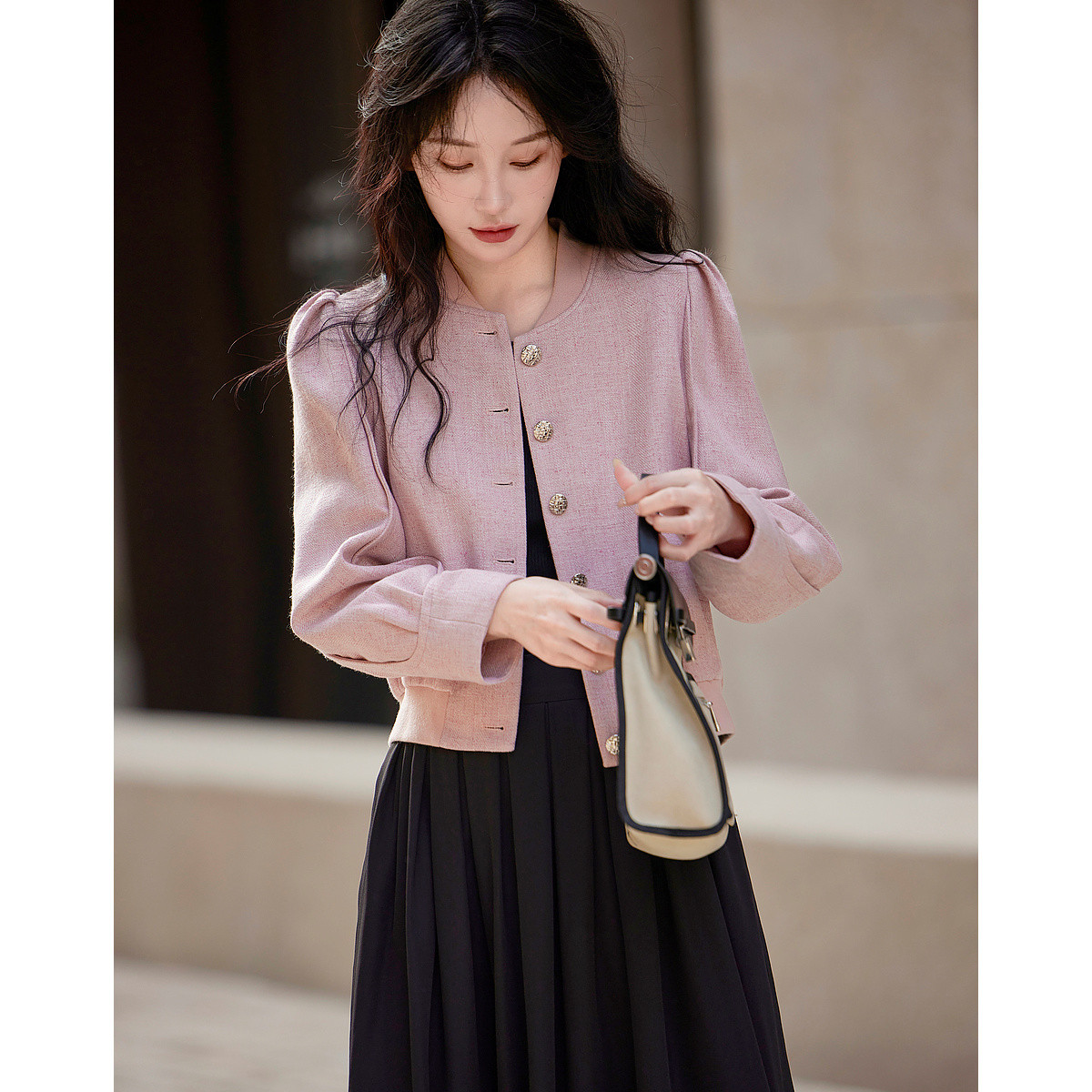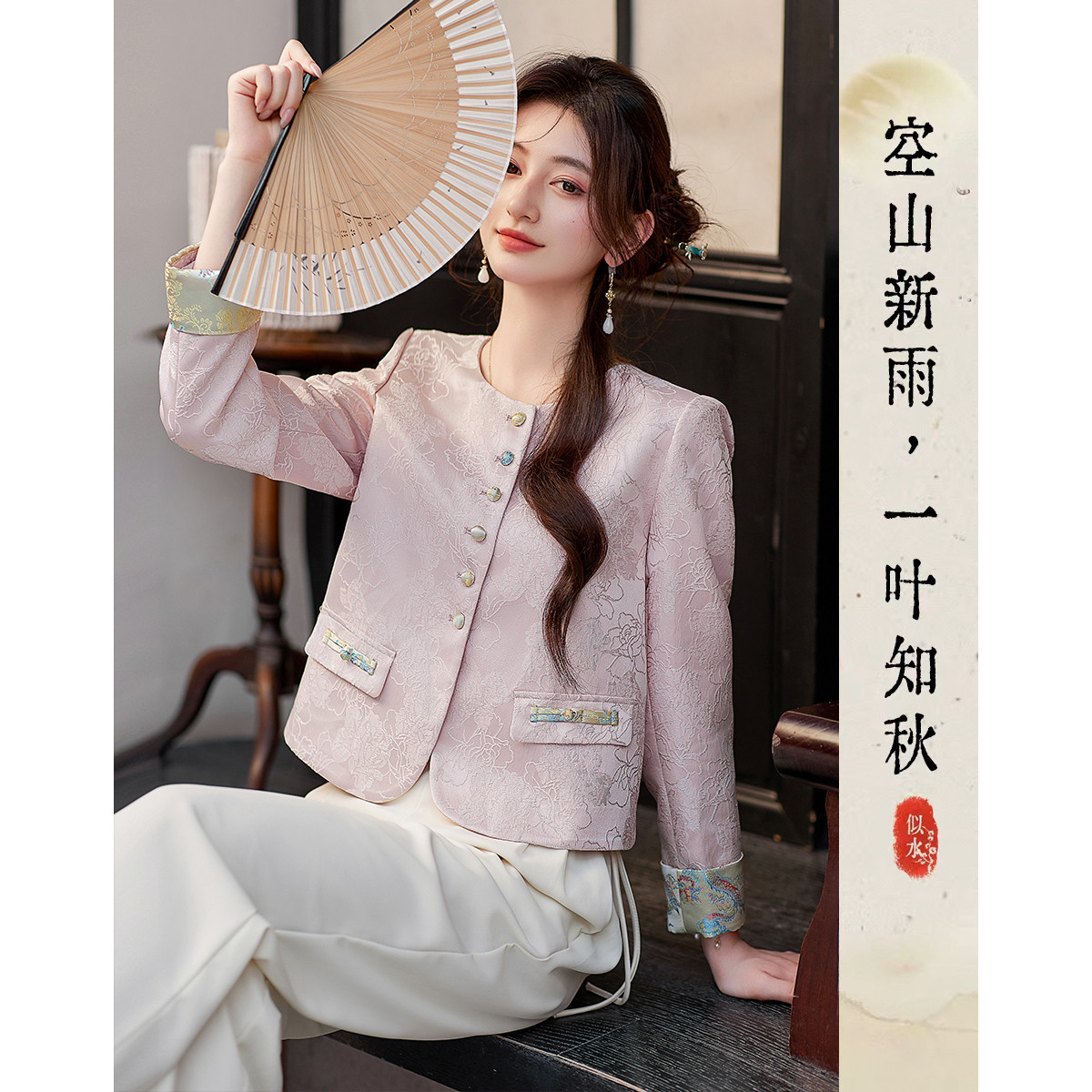 春单排扣圆领袖口拼色提花国风短外套女上衣 607064