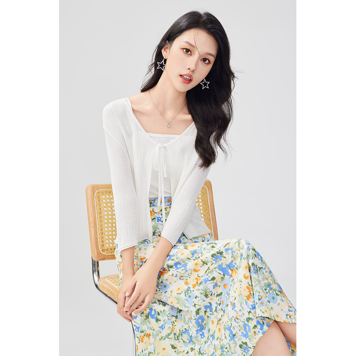 【含桑蚕丝含莱赛尔】夏季系带V领七分袖轻薄镂空披肩外套女上衣 413855