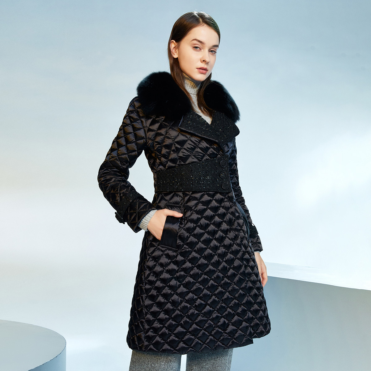 小香风狐狸毛领菱形格纹收腰显瘦中长款女士羽绒服 361695