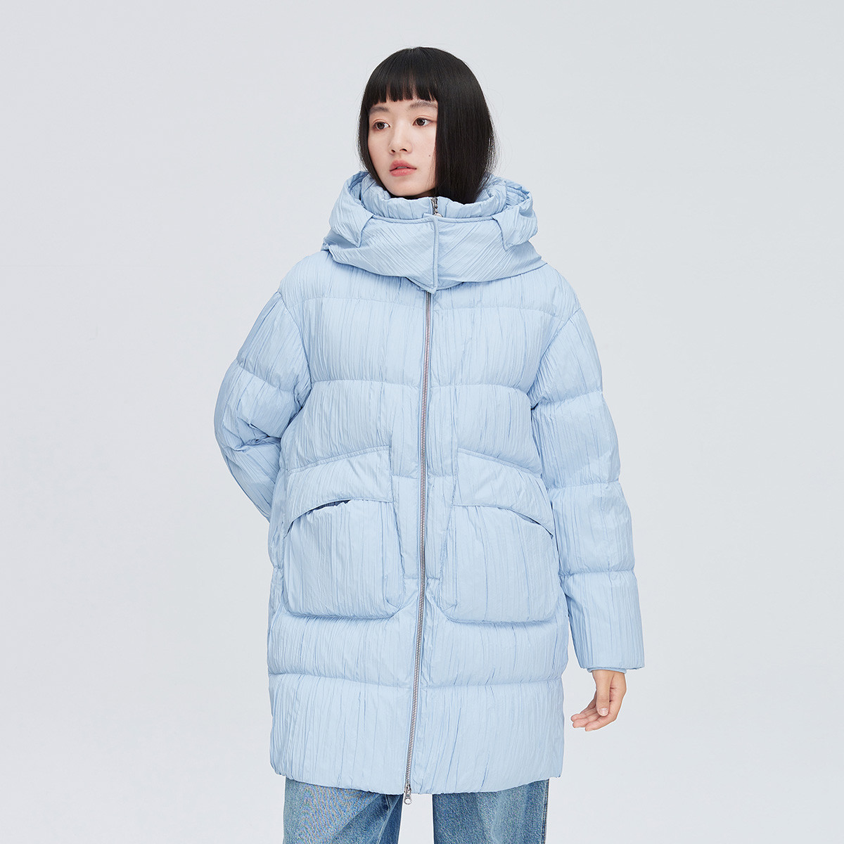 【商场同款】时尚贝壳抽褶中长款羽绒服女御寒连帽鸭绒服女式外套 139606