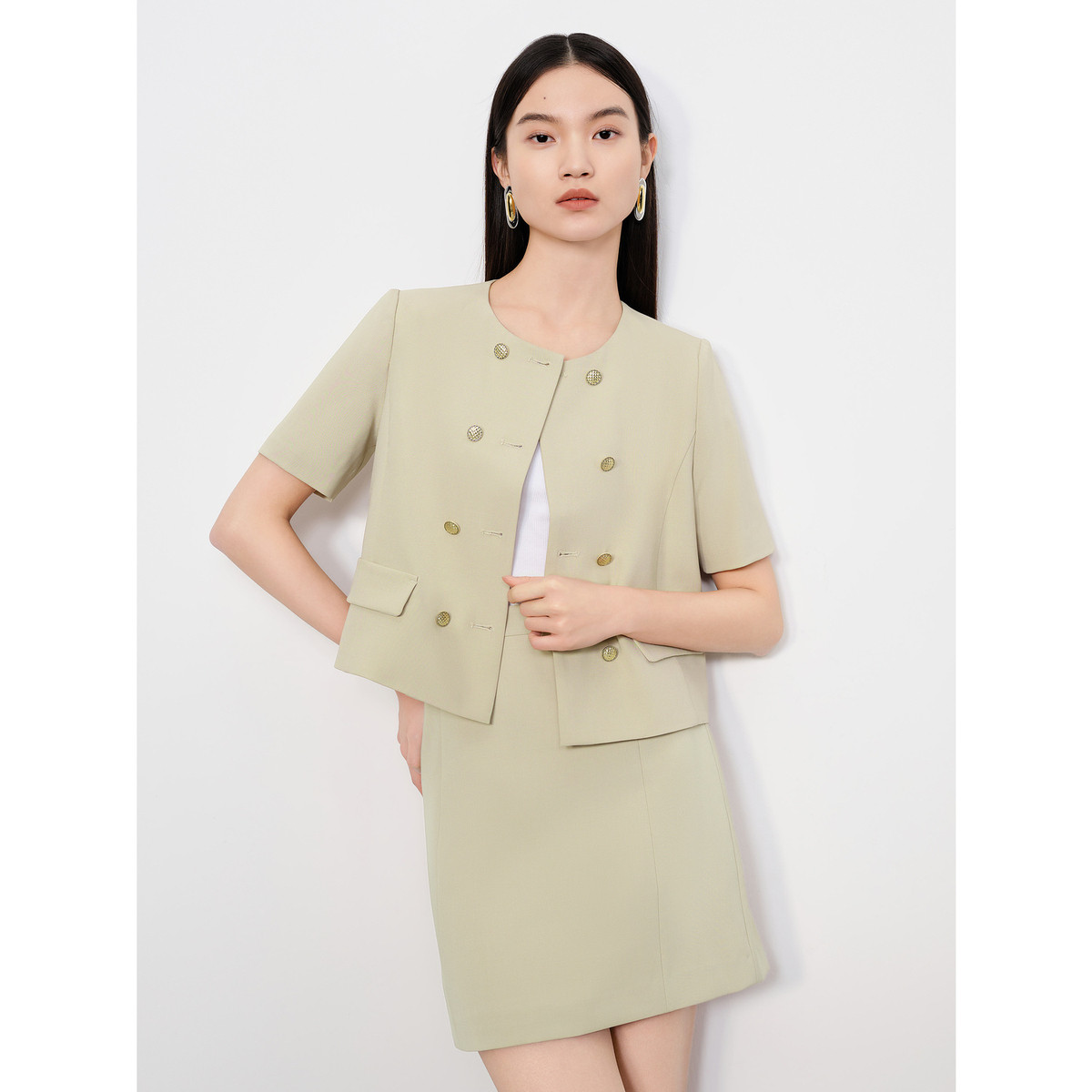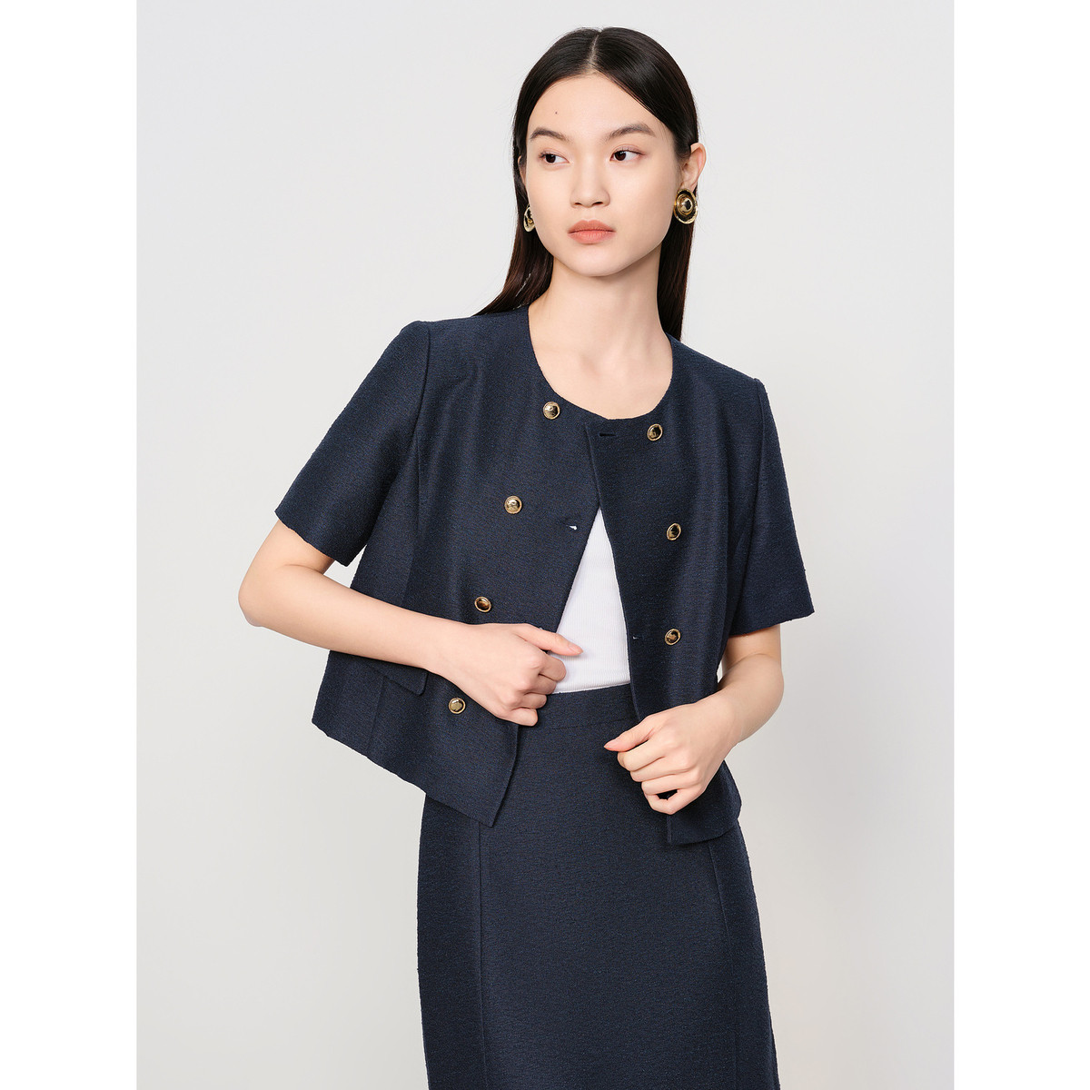 旗下安娜蔻系列静奢小香风通勤OL肌理感双排扣休闲外套女夏季 975052