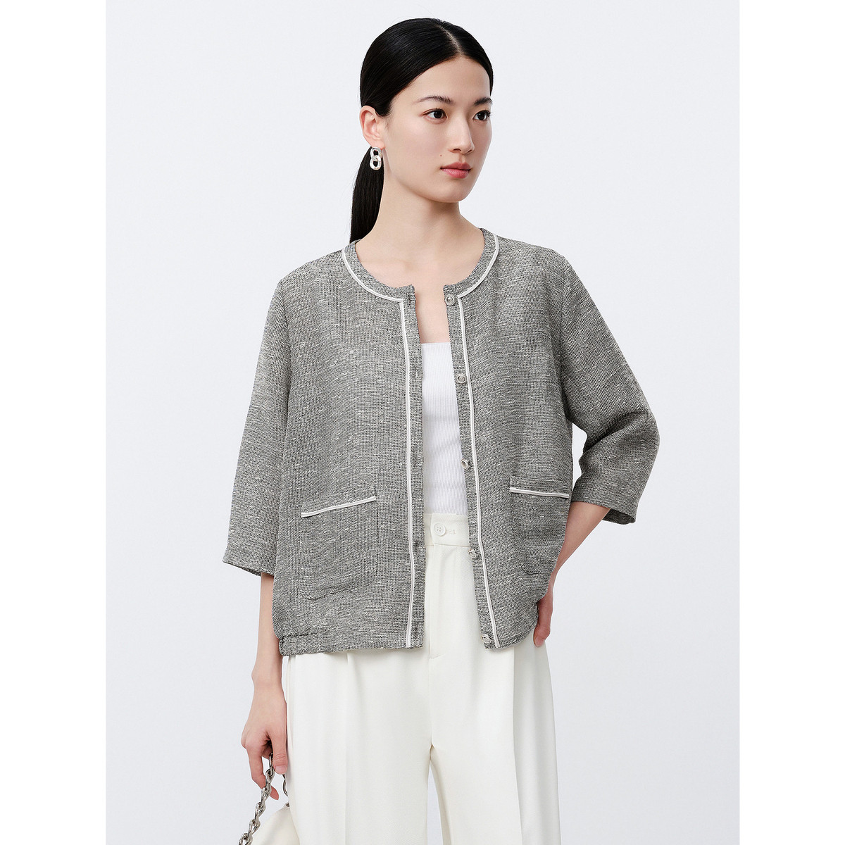 玖姿旗下安娜蔻系列小香风亮丝混纺圆领轻薄休闲外套上衣女夏季 371724
