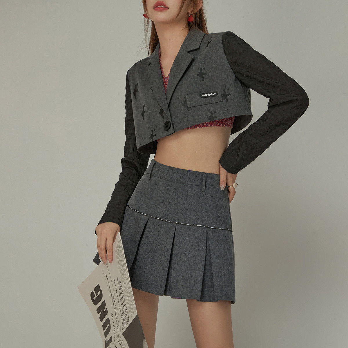 CHUU字母刺绣短袖西装女装夏辣妹挂带短款小西服 605203