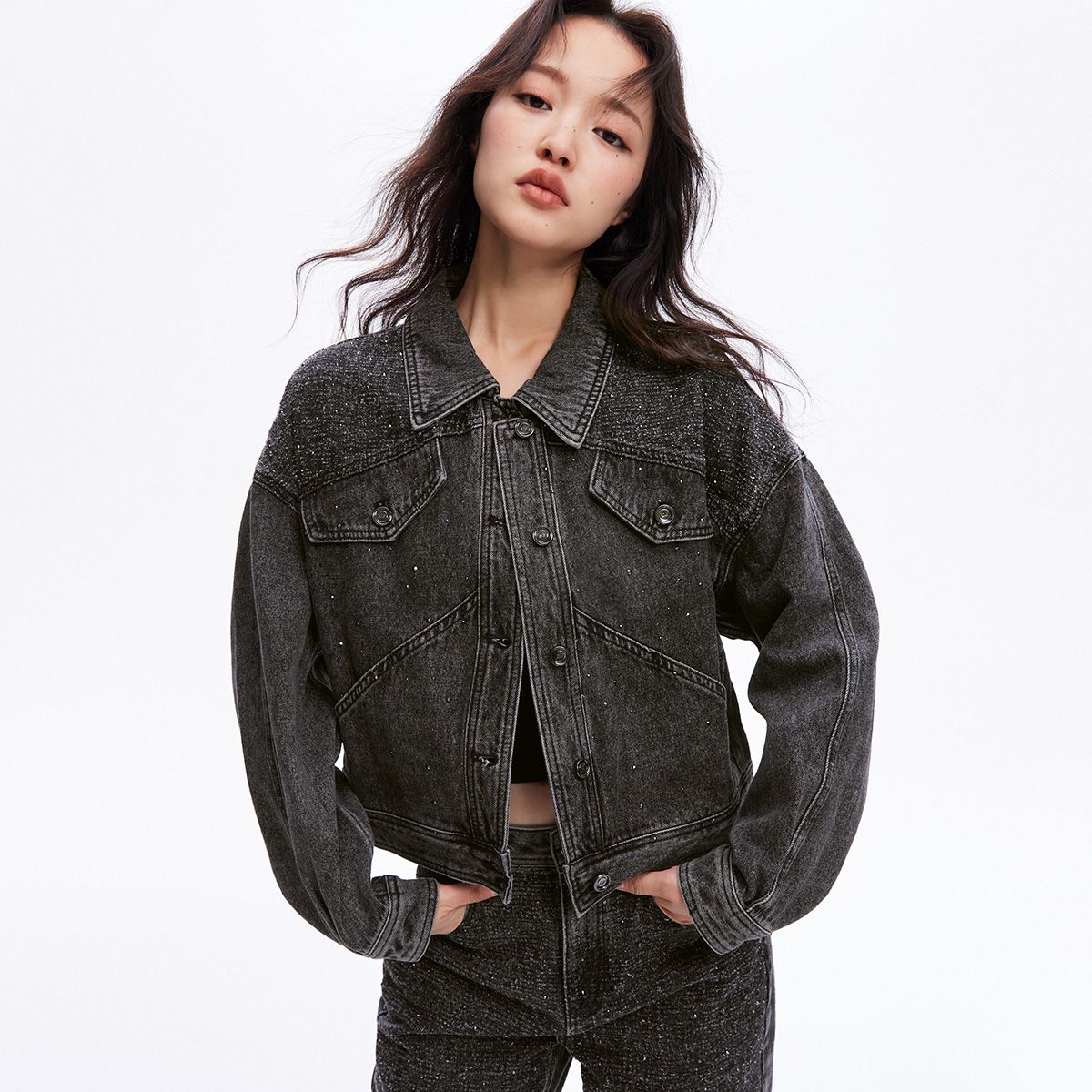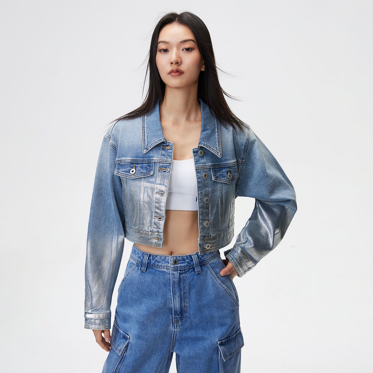 【简约宽松】春季落肩翻领长袖短款牛仔外套女 873690