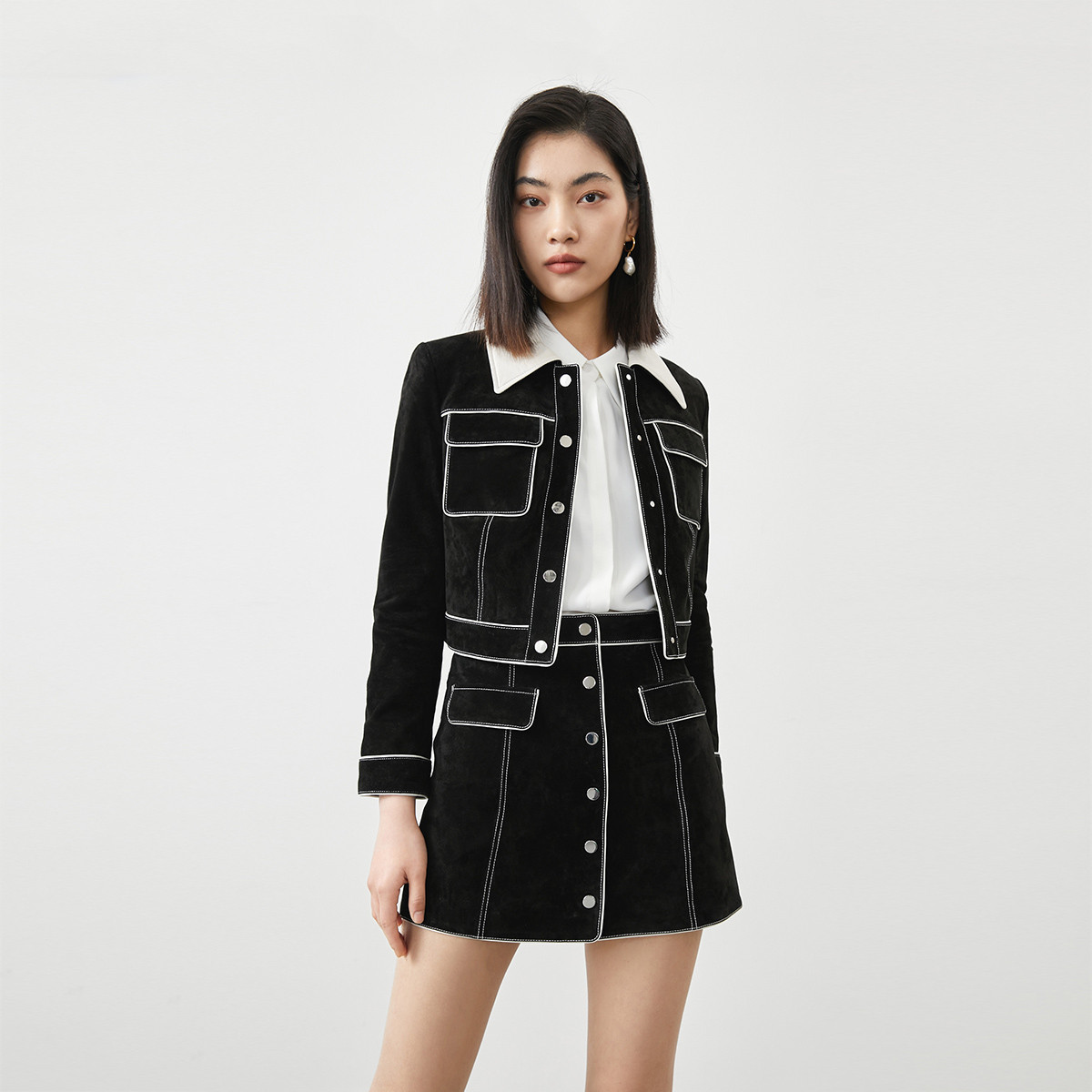 通勤百搭优雅拼色九分袖短皮衣外套女 496657