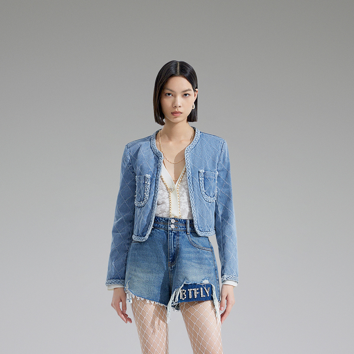 春装 小香风菱格编织设计感短款牛仔外套女 596047