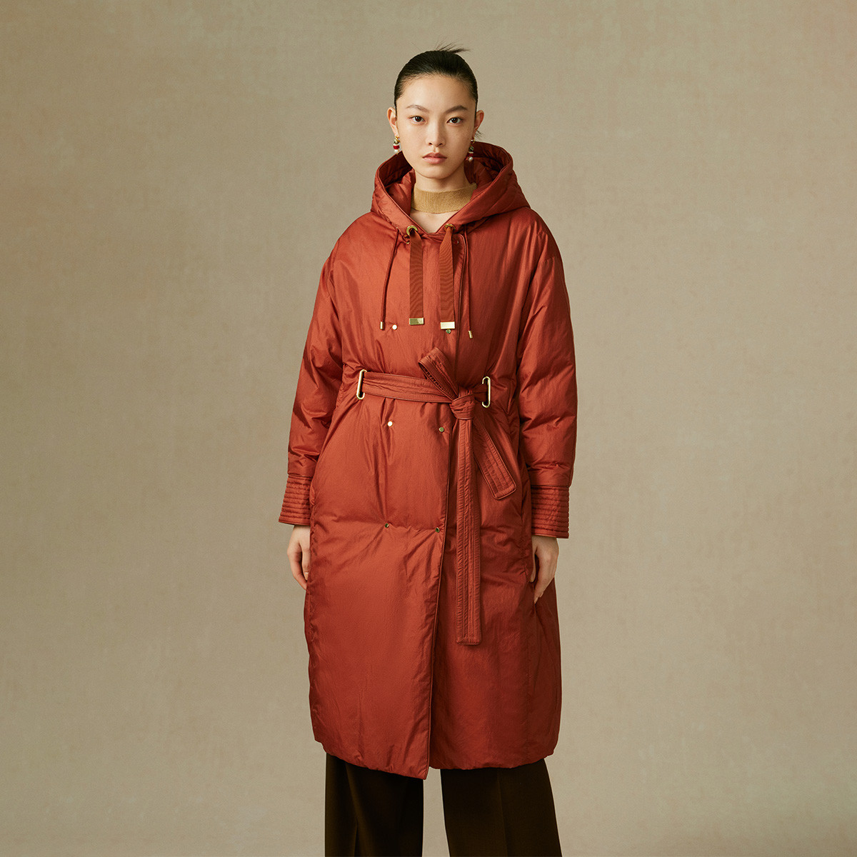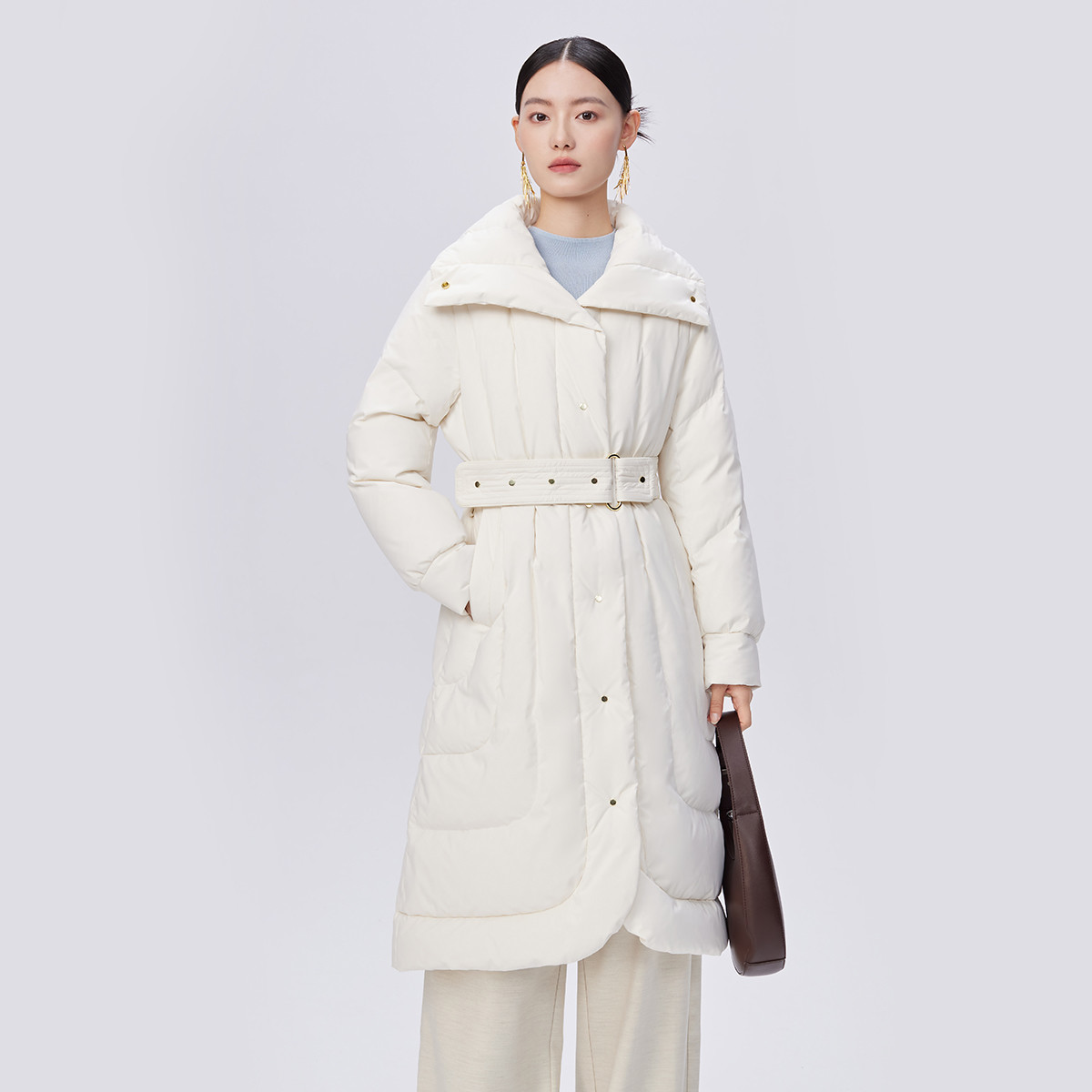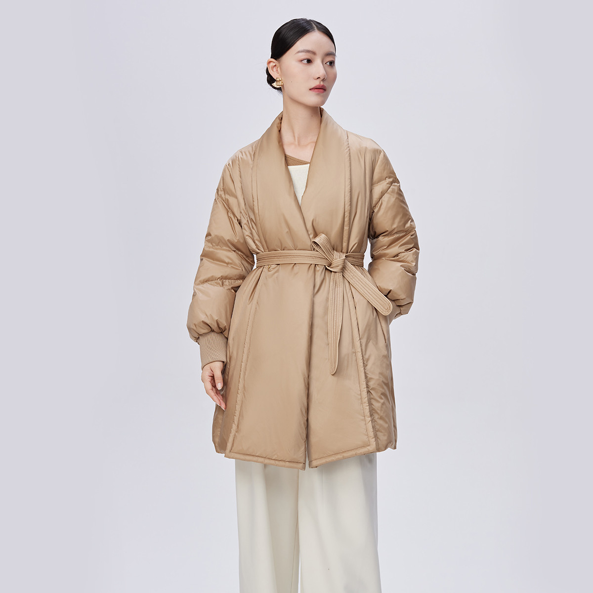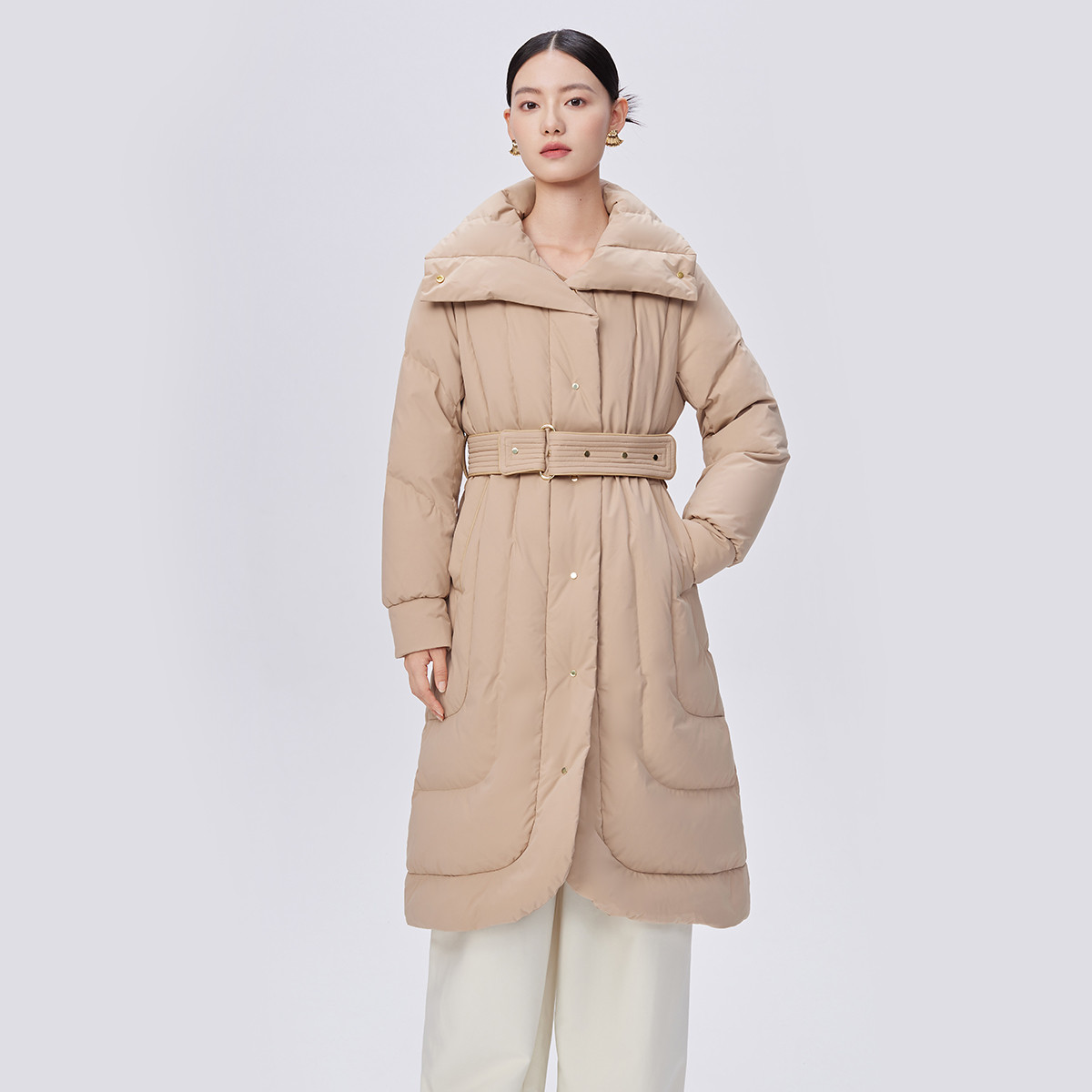 【国色系列】复古翻领羽绒服女中长款系带收腰鹅绒服女 870294