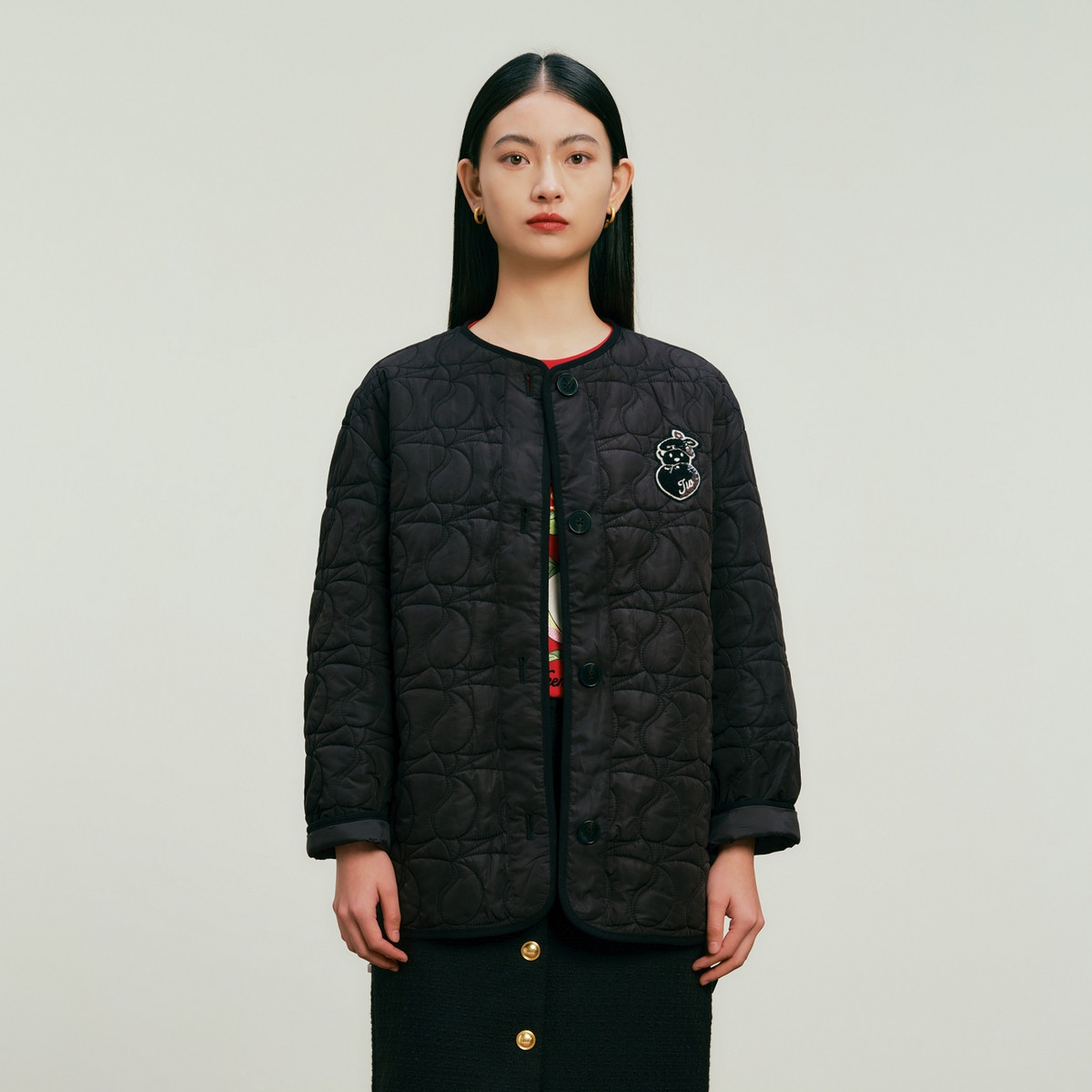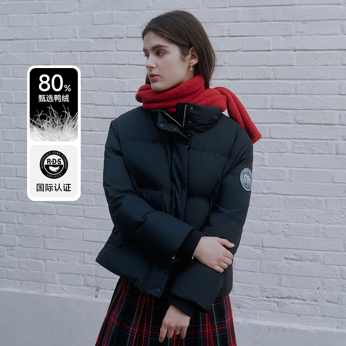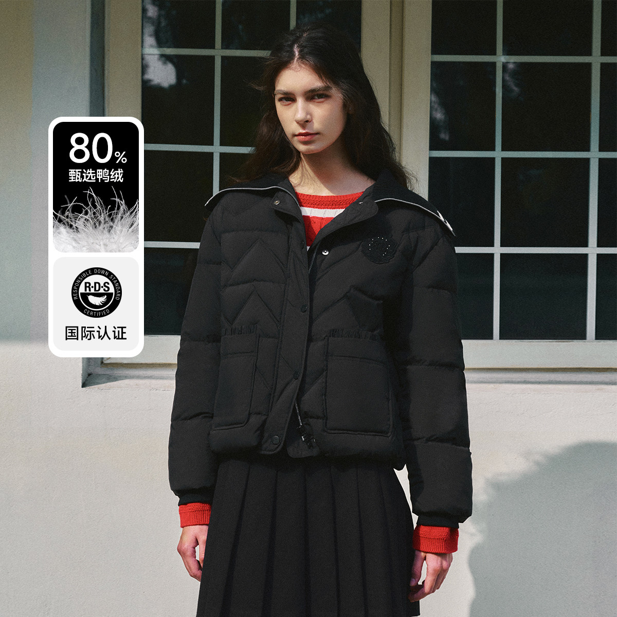 小熊绗缝轻薄黑色羽绒服短款翻领外套女装 705217