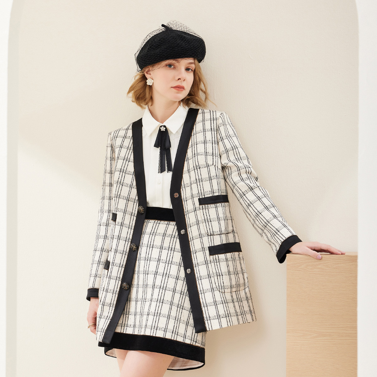 春季轻奢风时尚花纱格子直筒长袖优雅气质女式外套 361631