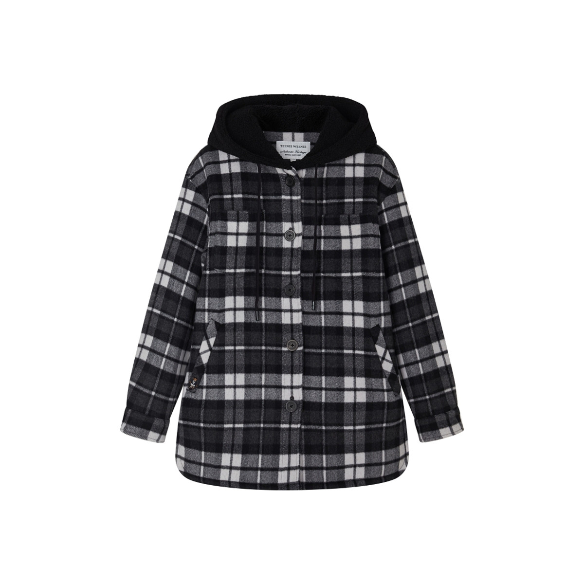 小熊毛呢大衣女冬季格纹连帽小个子学院风休闲百搭大衣外套女 408193