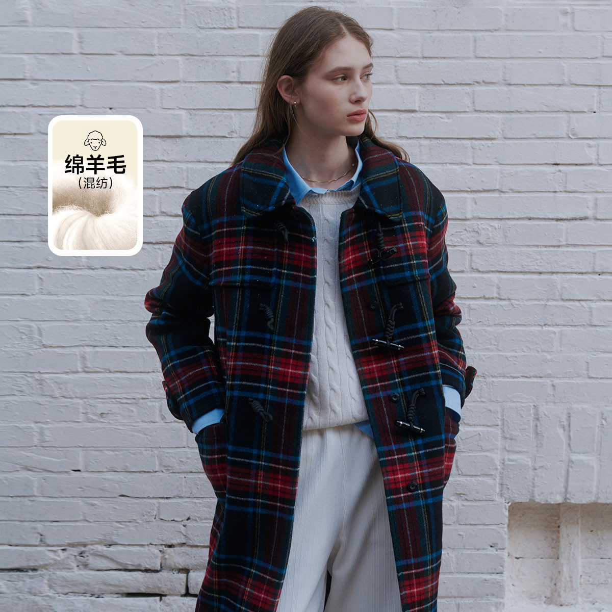 小熊秋冬款绵羊毛混纺牛角扣格纹毛呢大衣外套女款 015553