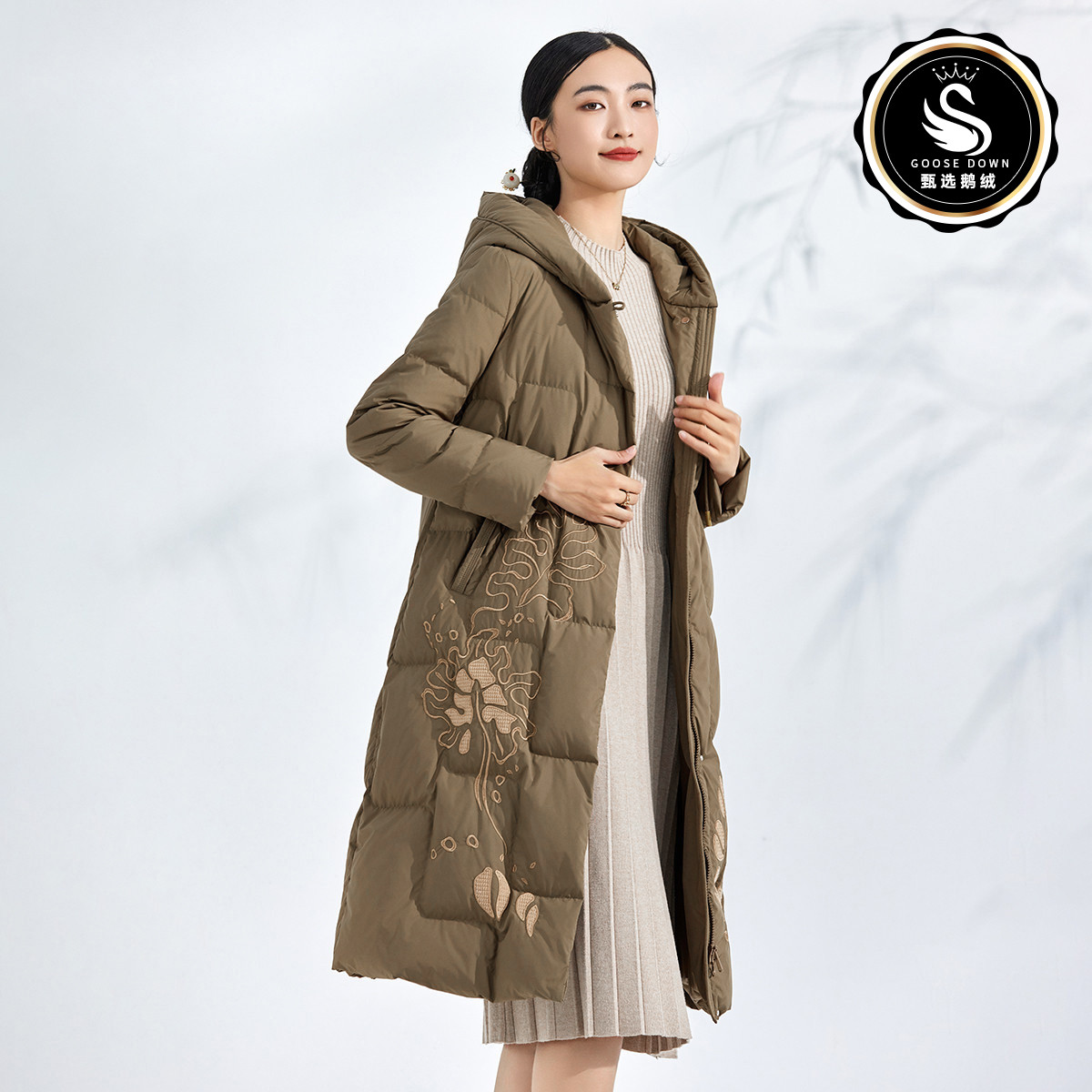 【鹅绒】国风妈妈装修身连帽轻暖刺绣舒适长款中老年羽绒服 570975
