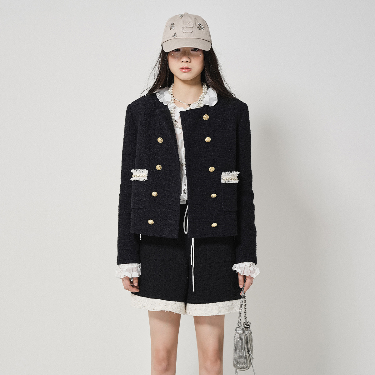 地素粗花呢外套秋立体珍珠钻扣黑白粗花呢女 992203