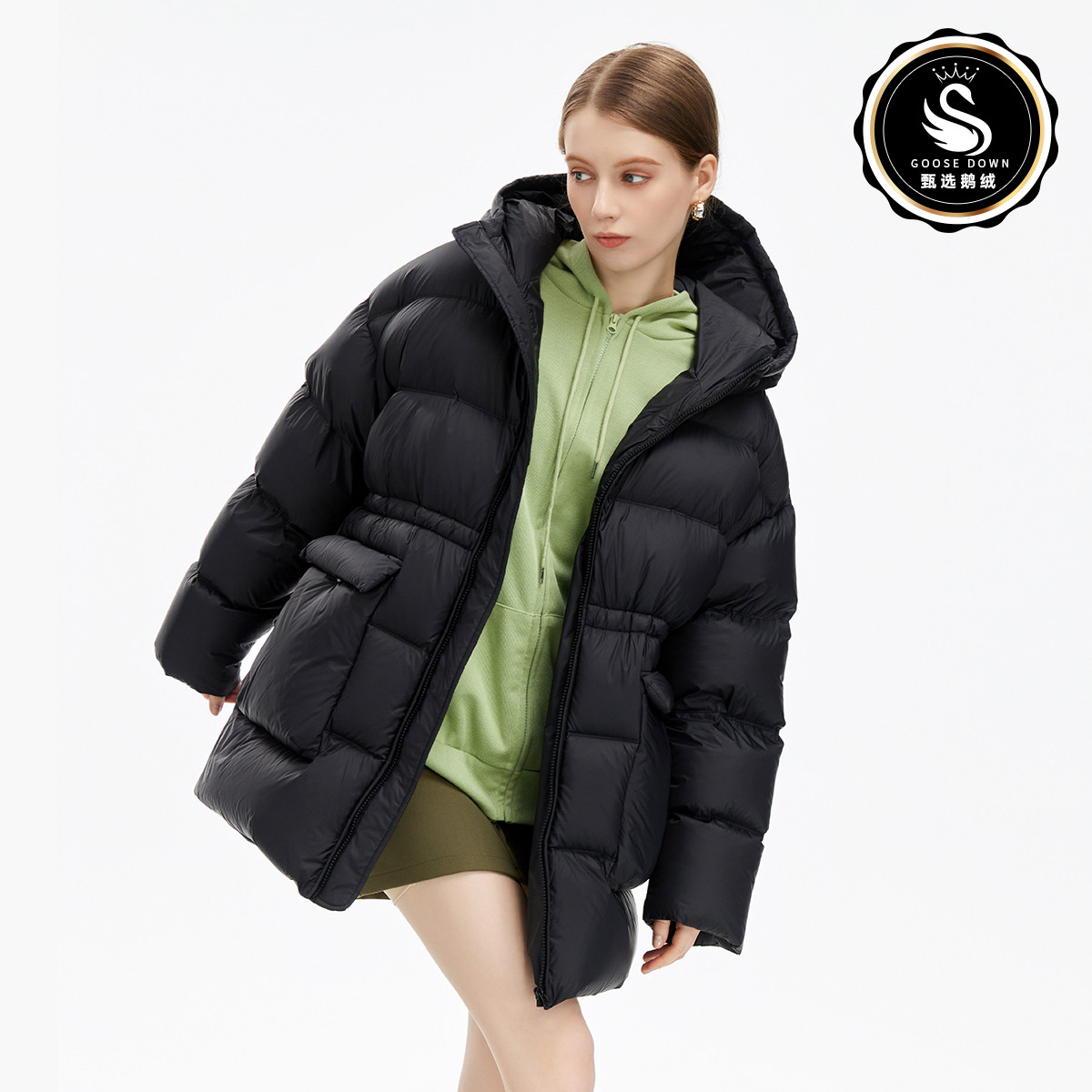 【鹅绒】运动风带帽面包服宽松过膝长款女式羽绒服 633311