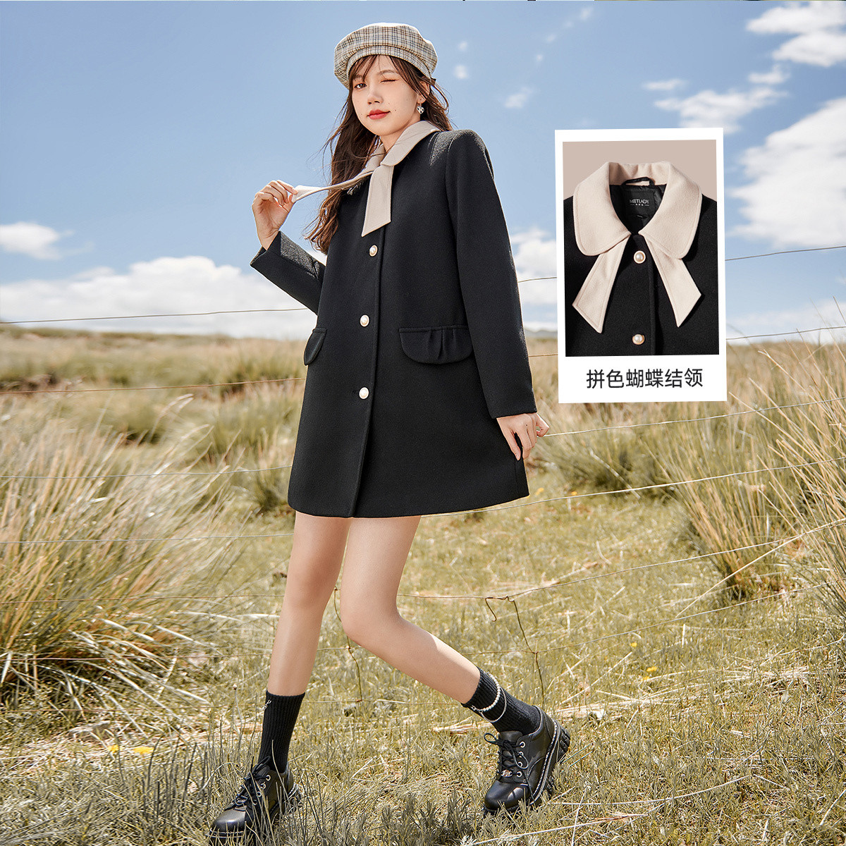 冬装撞色蝴蝶翻领呢大衣女简约加厚长袖中长款外套 487188