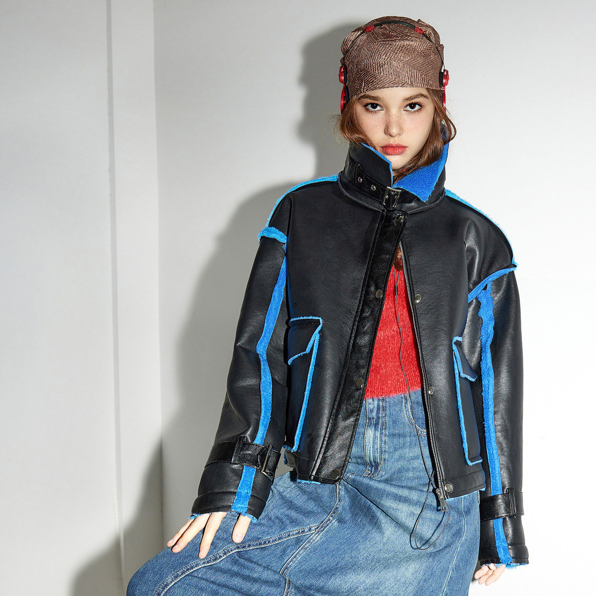 冬季热卖美式短款皮夹克厚外套女拼接毛领机车服 838804
