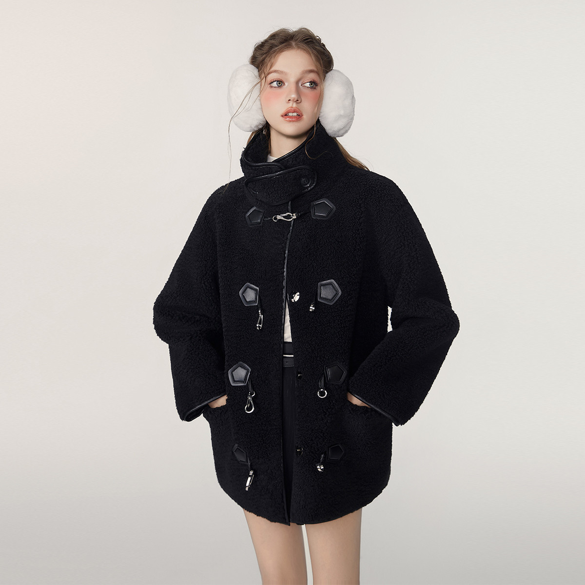 仿羊羔毛外套女纯黑立领金属皮扣保暖大衣 345044