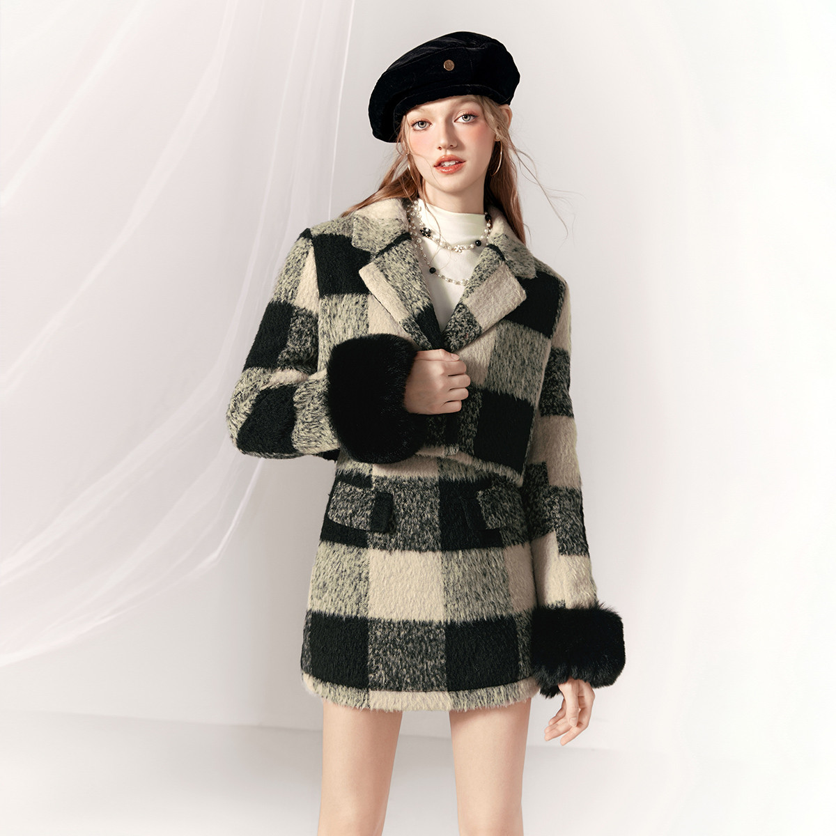 复古千金小香风毛呢大衣短款格纹保暖外套 747924