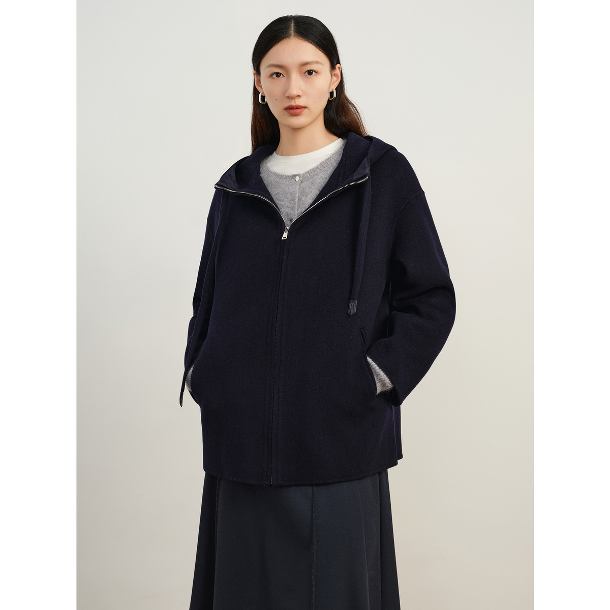 玖姿旗下安娜蔻系列经典简约连帽抽绳纯羊毛大衣女冬季 090700