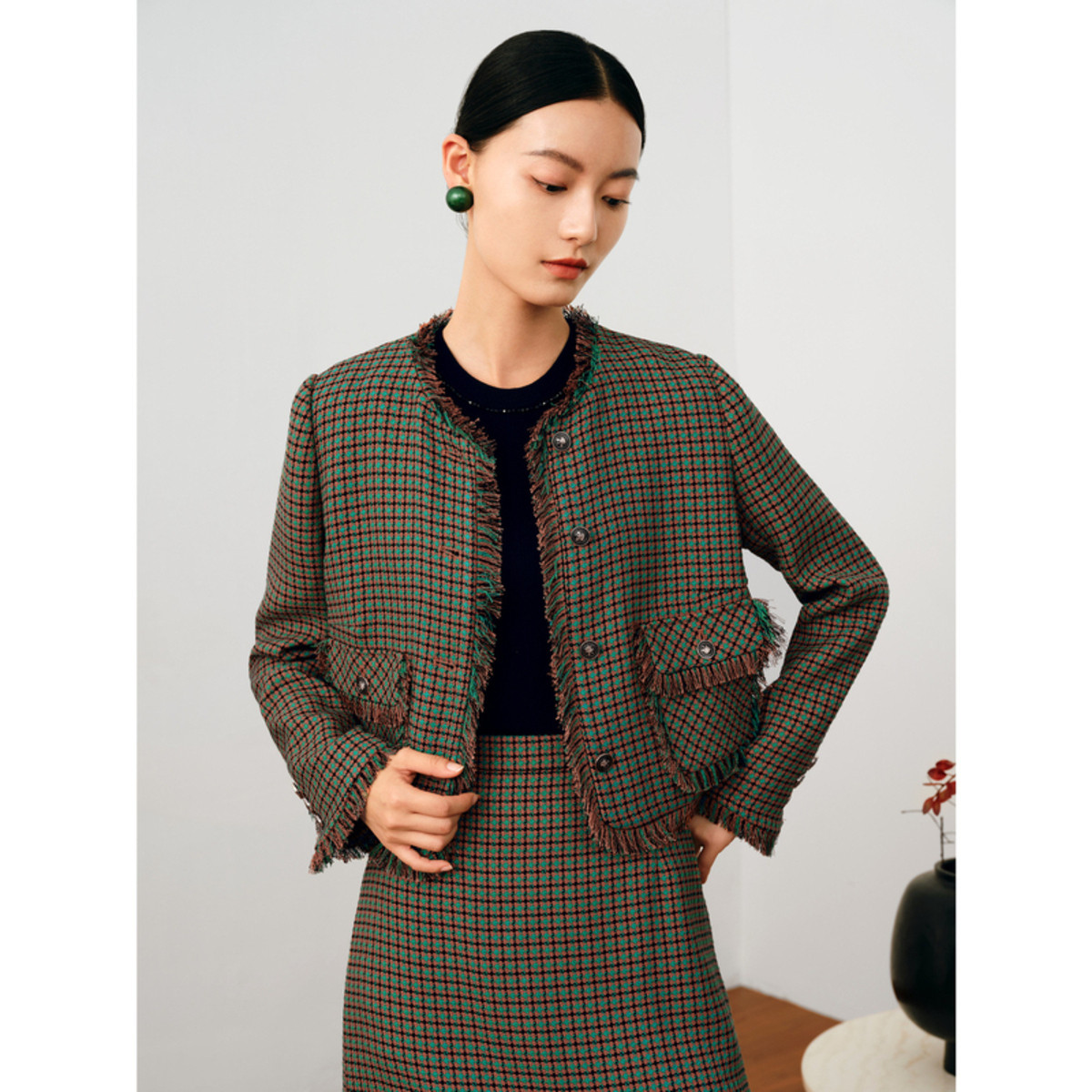 玖姿旗下安娜蔻系列优雅格纹法式复古直筒毛边外套女秋季 249036