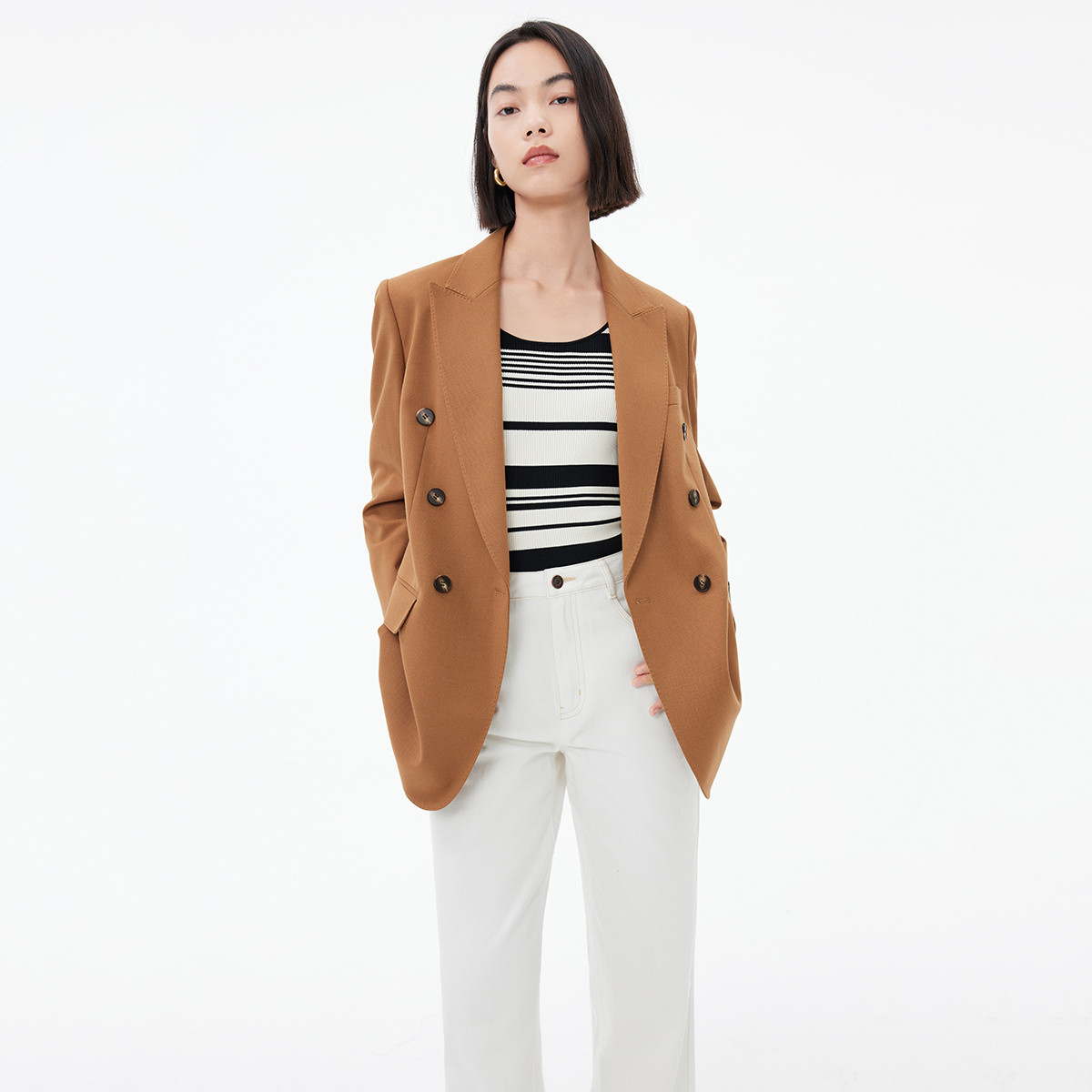 春季款含绵羊毛都市通勤宽松复古双排扣棕色西装外套 104411