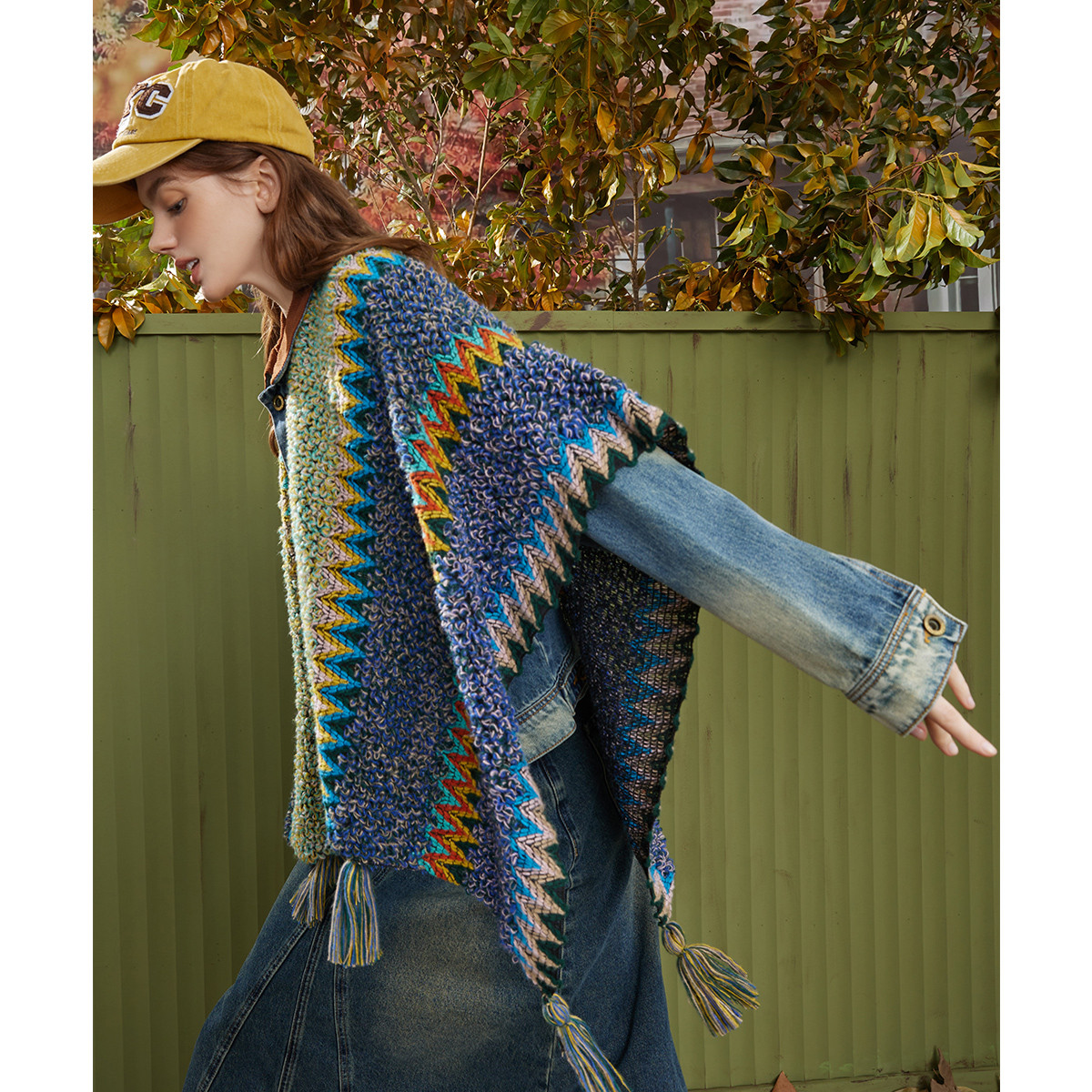 新撞色花纹设计流苏披肩复古民族风围巾毛毯 518749