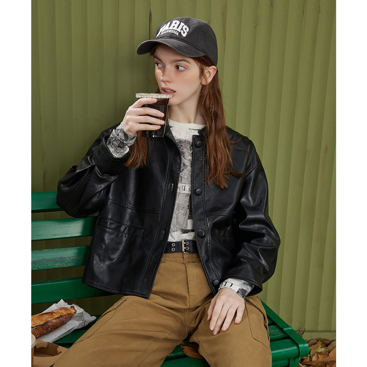 新纯色简约甜酷风短款外套休闲个性女士皮衣 437021