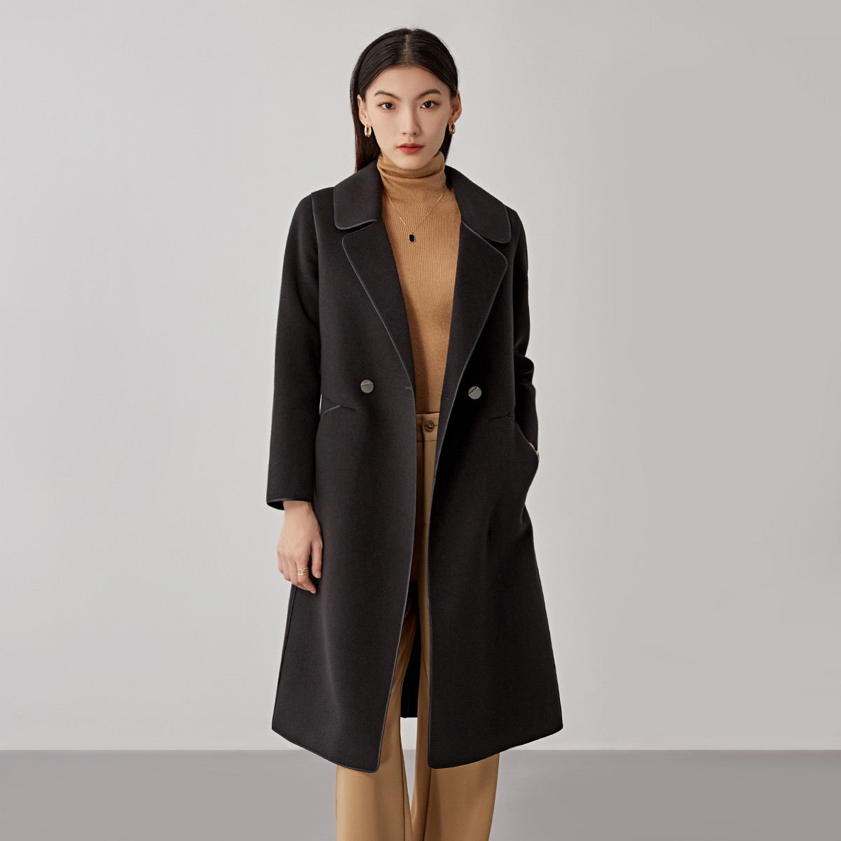 玖姿旗下安娜蔻系列简约系带双面呢一手长大衣女冬季 083852