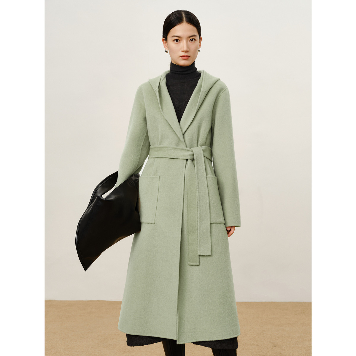 玖姿旗下安娜蔻系列收腰连帽双面呢长款羊毛大衣女冬季 504140