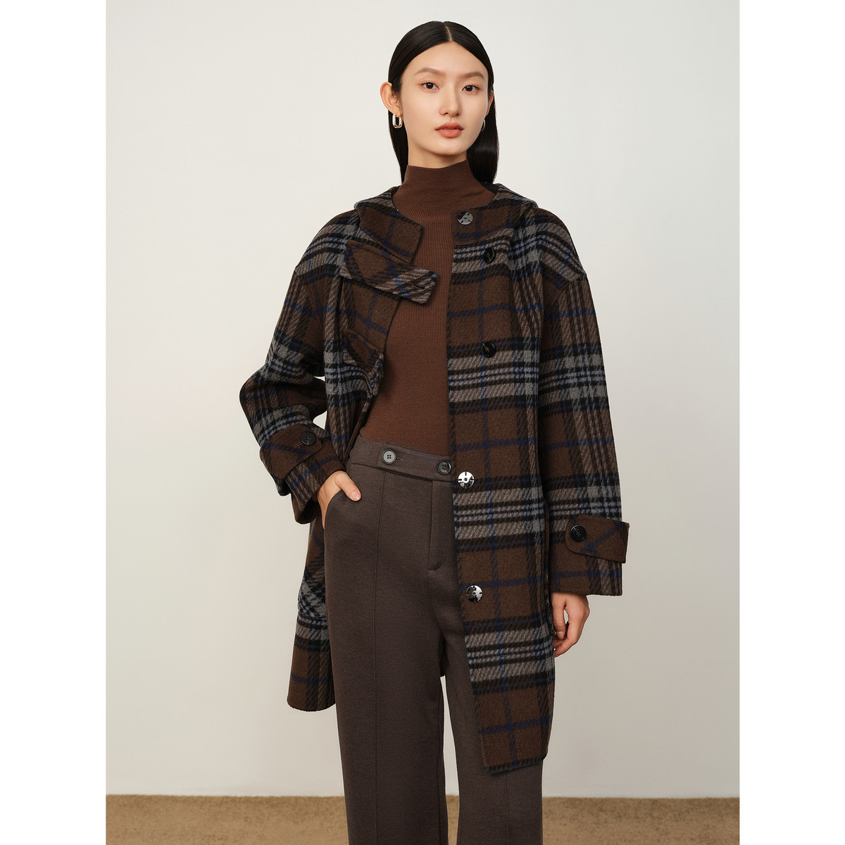 玖姿旗下安娜蔻系列复古连帽格纹直筒中长款大衣女冬季 035020