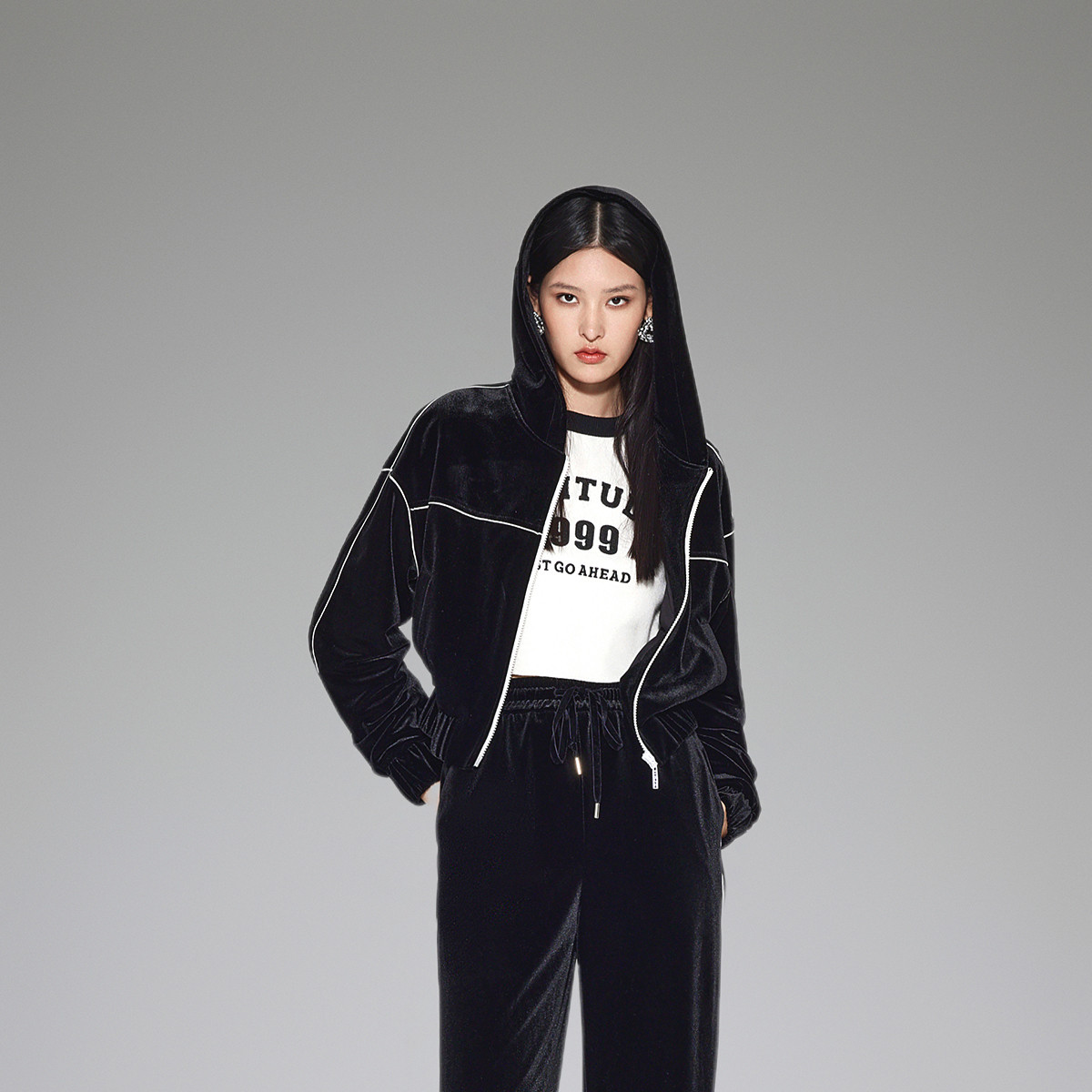 黑标系列春装 休闲连帽短上衣弹力丝绒运动外套女 311311