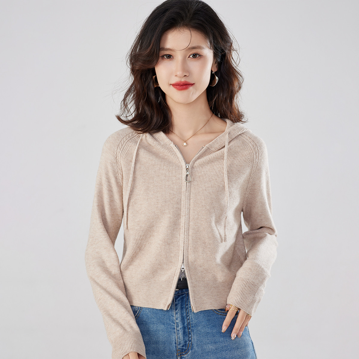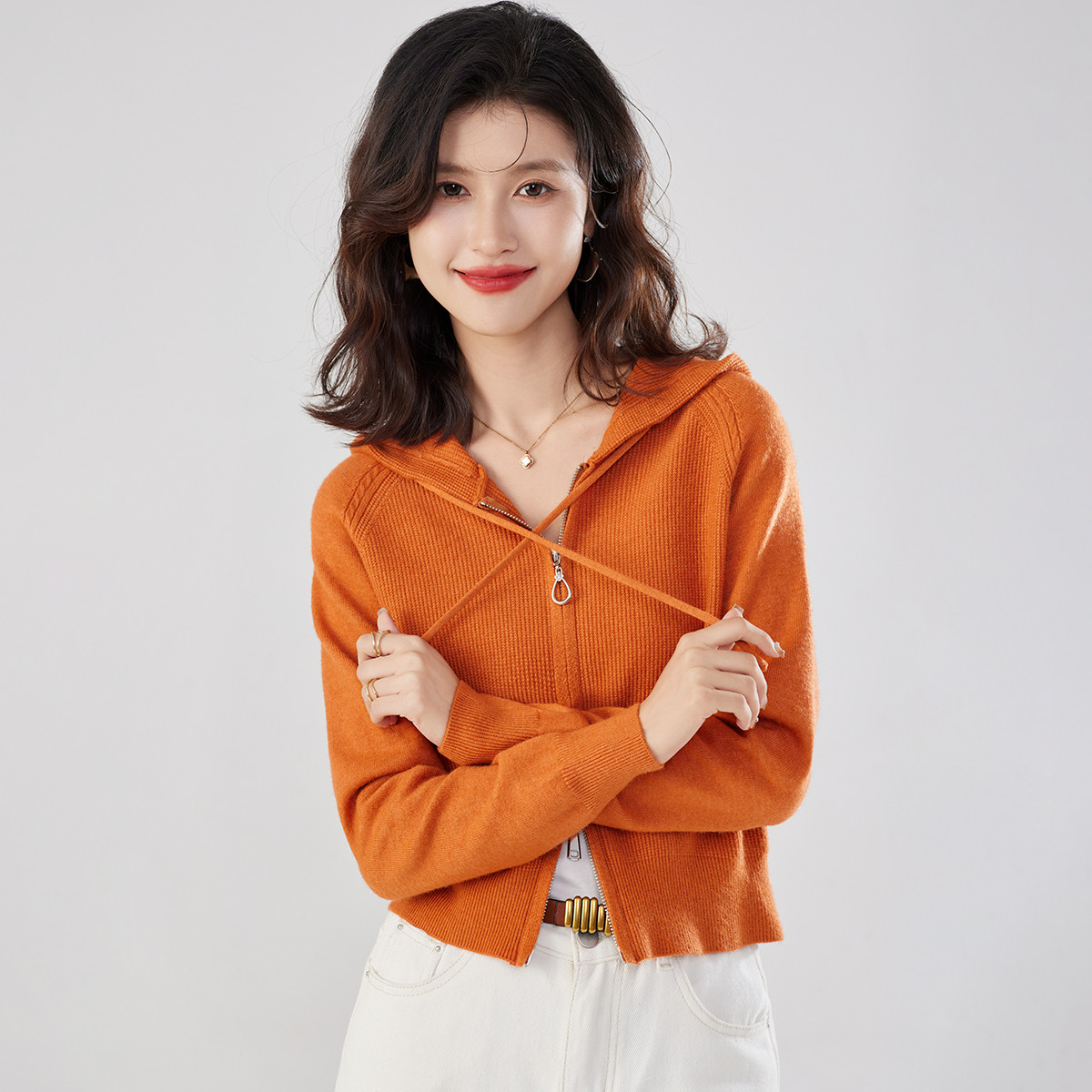 【气质双开拉链】休闲时尚复古纯色连帽拉链卫衣式针织开衫女 245535