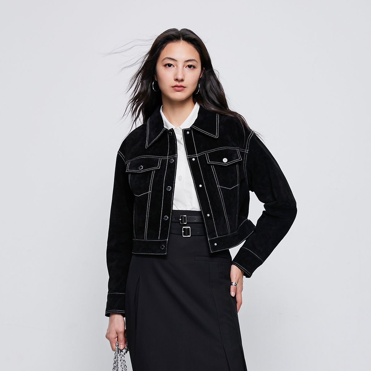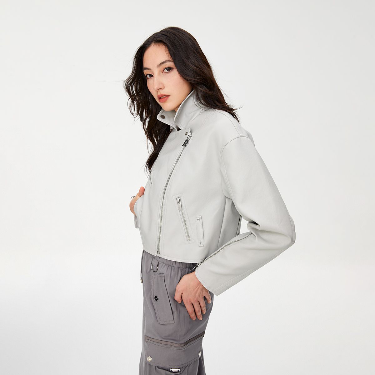 【翻领皮衣】春季精致短款翻领直筒夹克皮衣女 056218